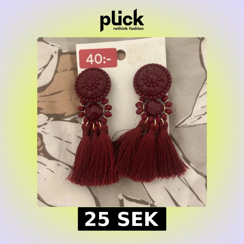 Snygga mörkröda örhängen från H&M med stora runda detaljer och glittriga stenar. De har flera tofsar som hänger ner och ger en cool och trendig look. Perfekta för att lyfta din outfit med lite extra färg och stil.