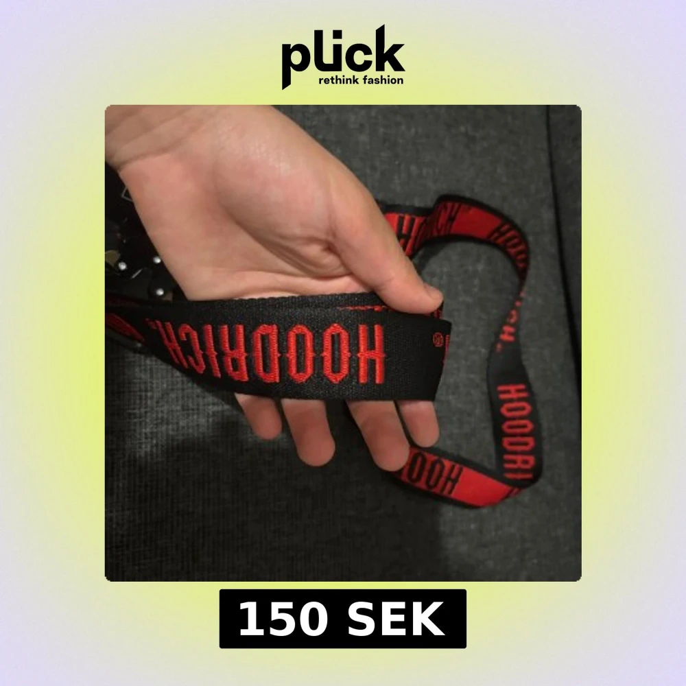 Säljer ett svart bälte från HOODRICH med röd logotyp längs hela bandet. Bältet har en robust metallspänne och en tillhörande svart väska med vit och röd HOODRICH-tryck. Perfekt accessoar för streetwear-stilen.