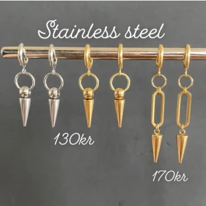 örhängen och halsband  - Stilrena örhängen och halsband inspirerade av Maria Nilsdotter. Material-rostfritt stål. Örhängen längd-3,7cm, halsband längd-40cm. ☝️Vid köp ingår två extra berlocker som kan bytas ut, då själva hänget är ömtåligt och känsligt för stötar.
