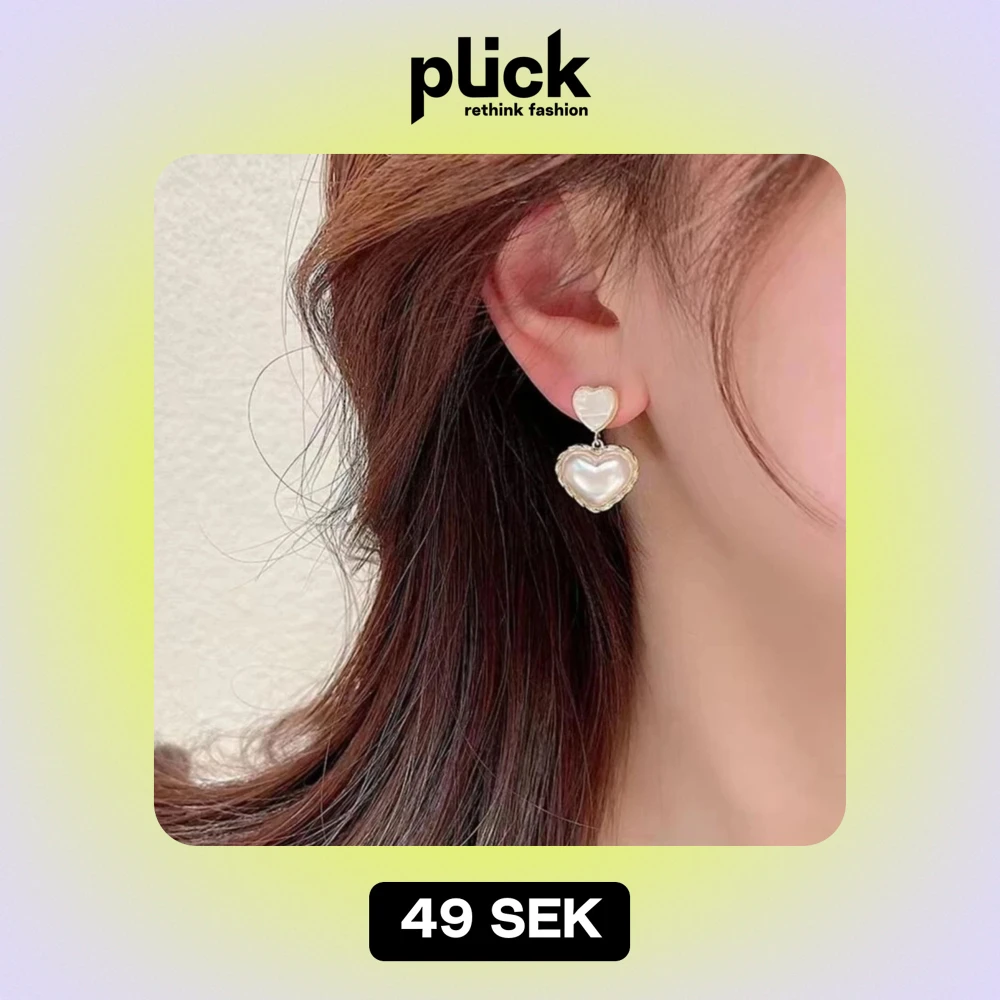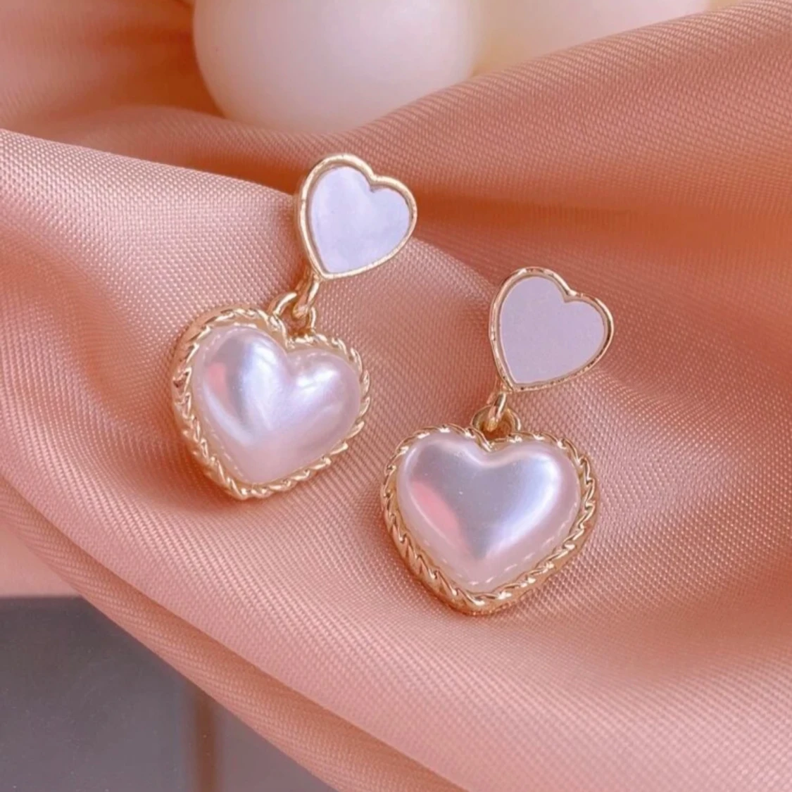 Dessa örhängen är perfekta för att ge en romantisk touch till din outfit. De har en hjärtformad design med en pärlemorliknande yta och guldfärgad kant. Örhängena är både eleganta och lekfulla, vilket gör dem idealiska för både vardag och fest.