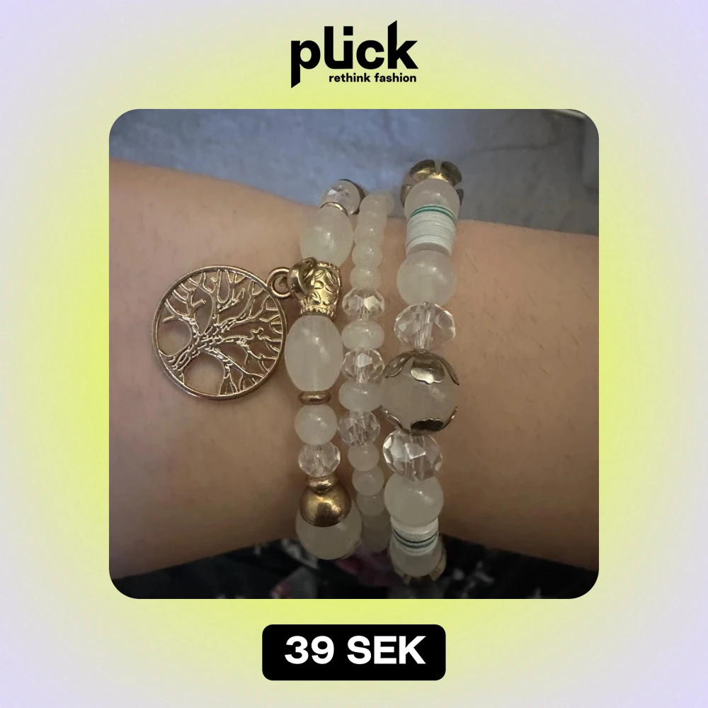Säljer ett set med flera armband i olika vita och genomskinliga pärlor. Ett av armbanden har en snygg guldberlock med livets träd. Perfekt för att ge en bohemisk touch till din outfit. Passar både till vardag och fest!