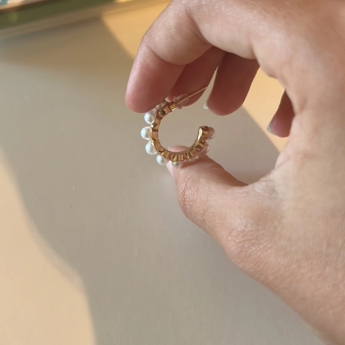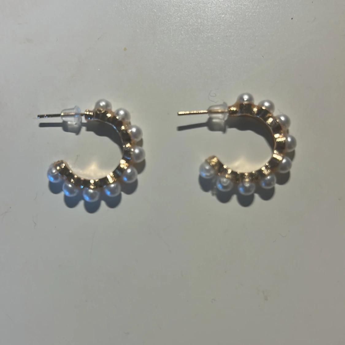 Snygga örhängen i form av små hoops i guldton med vita pärlor runt hela ringen. Perfekt accessoar för att lyfta din look med en touch av elegans och trendig vibe. Lätta att bära och passar till många stilar.💞