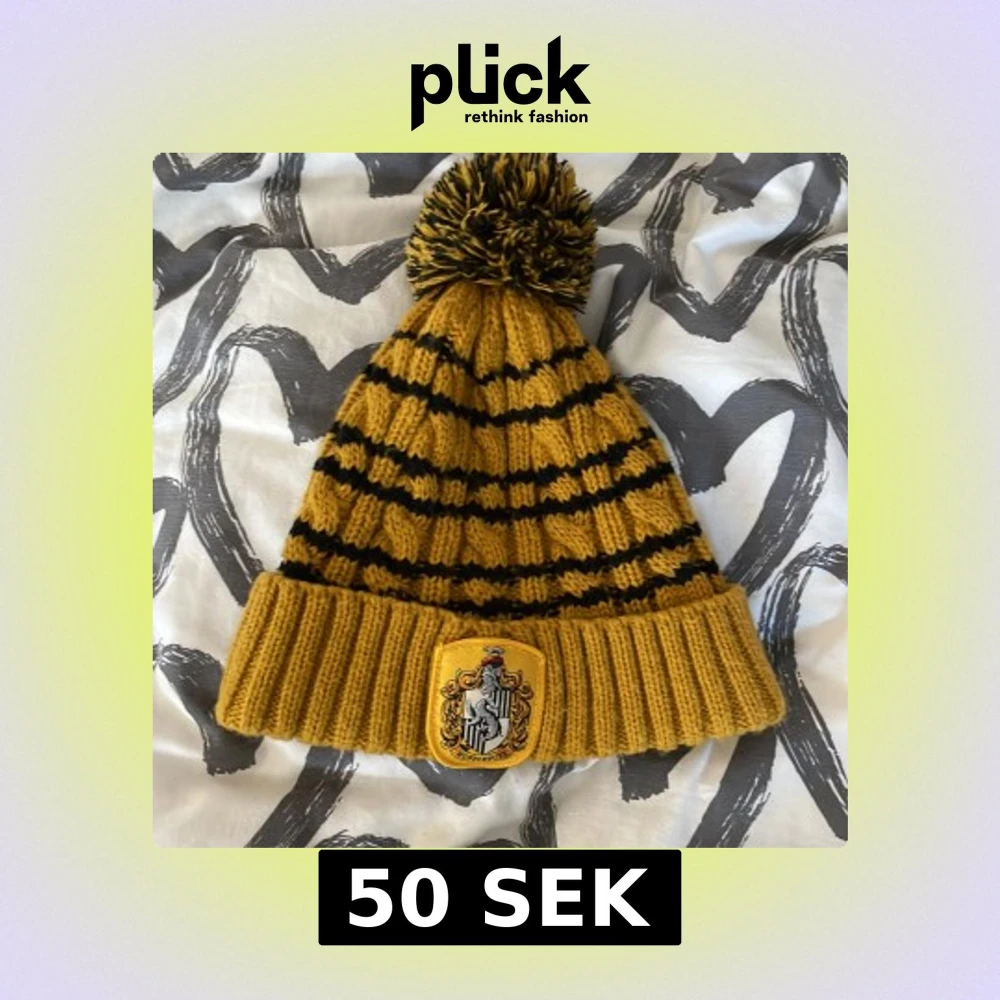 Snygg gul och svart randig mössa med stor tofs på toppen. Mössan har ett broderat emblem framtill och är ribbstickad för extra värme. Perfekt för kyliga dagar!