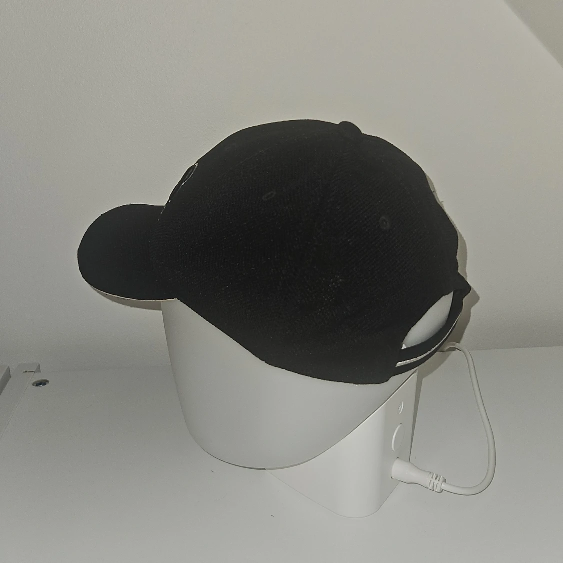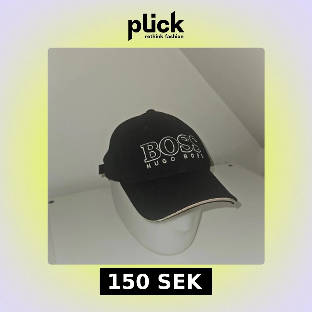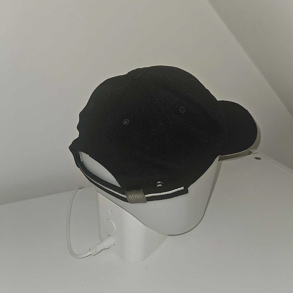 Svart keps från Hugo Boss med böjd skärm och justerbar rem baktill. Framsidan har stor vit broderad BOSS-logga och texten HUGO BOSS under. Kepsen är i bomull och har en klassisk, stilren look med vit detalj längs skärmens kant.