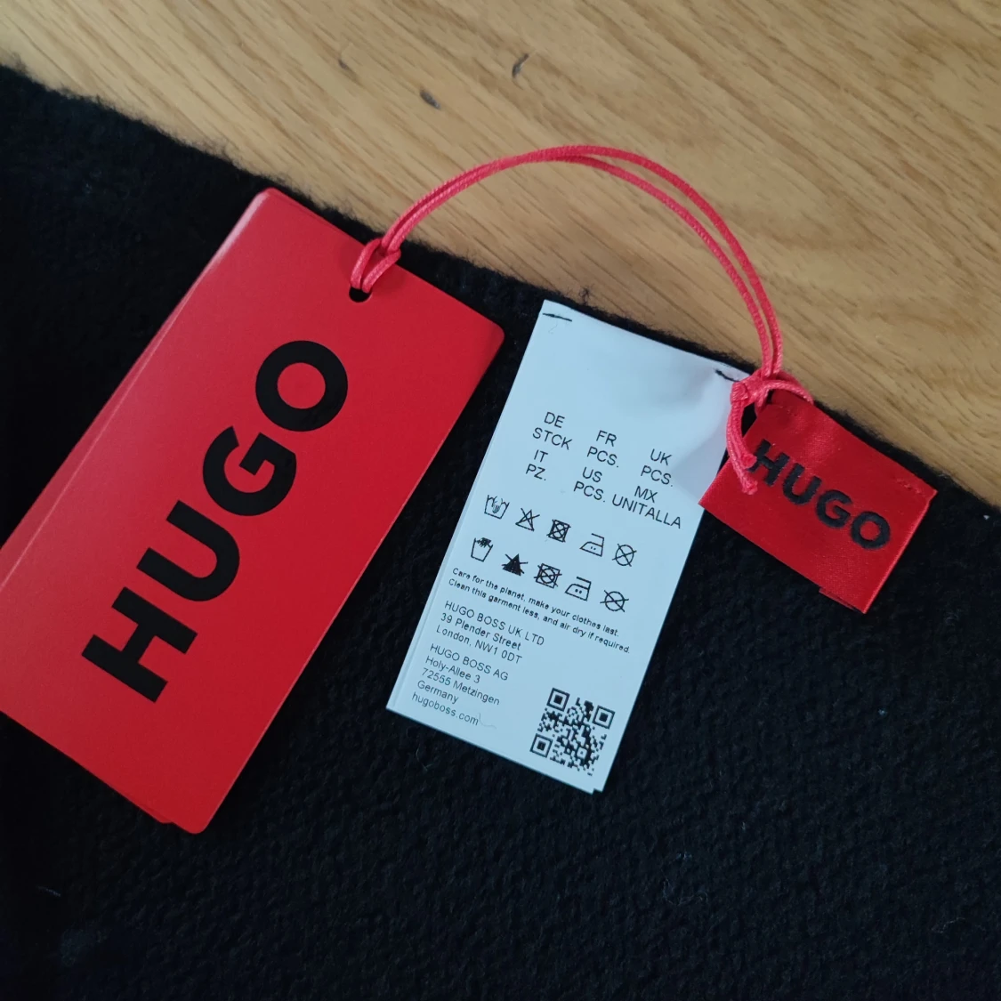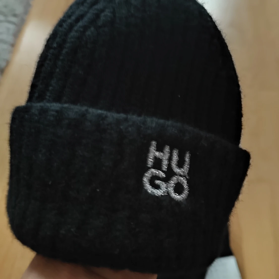 Svart ribbstickad mössa från Hugo Boss med vit broderad HUGO-logga framtill. Mössan är tillverkad i mjukt material och har en klassisk uppvikt kant. Perfekt för kalla dagar och snygg att matcha med din stil.