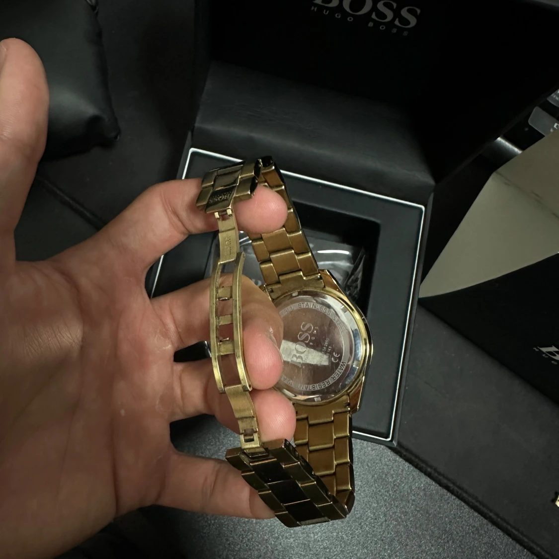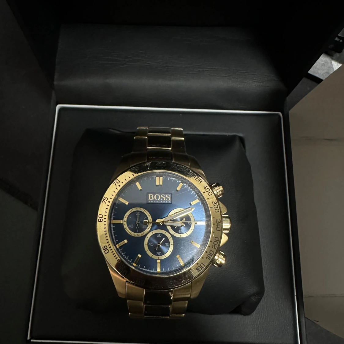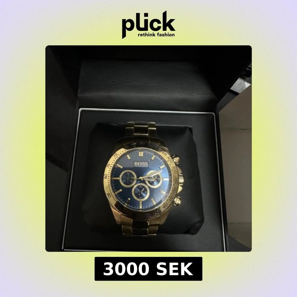 Stilren klocka från Hugo Boss med guldig länk och blå urtavla. Klockan har tre mindre urtavlor, tydliga index och kronograf-funktion. Snygg kombination av guld och blått som ger en lyxig känsla. Levereras i originalask med BOSS-logga. Nypris 6500. Finns några små repor som inte syns om man inte kollar noggrant. Vattenresistant klocka