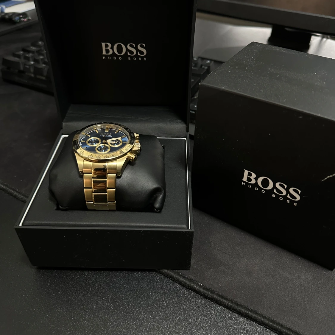 Guldig BOSS klocka med blå urtavla