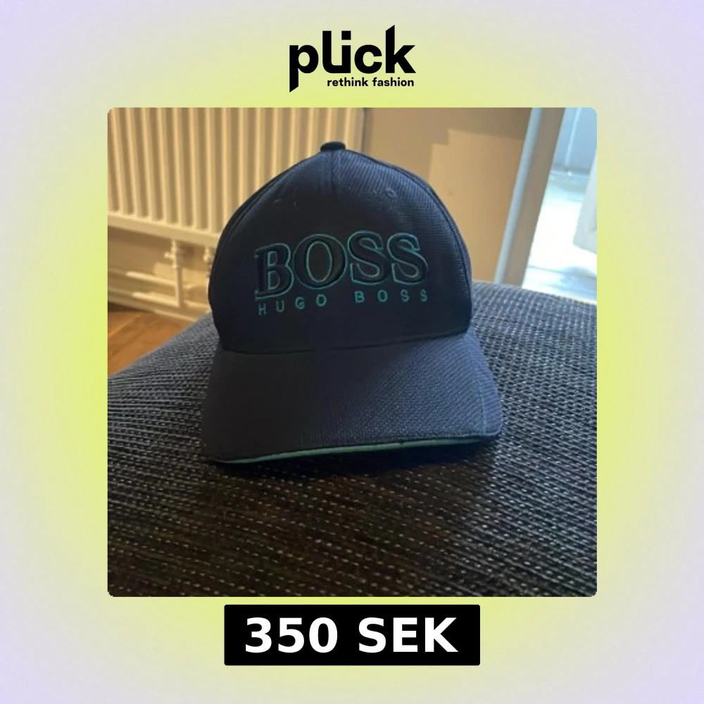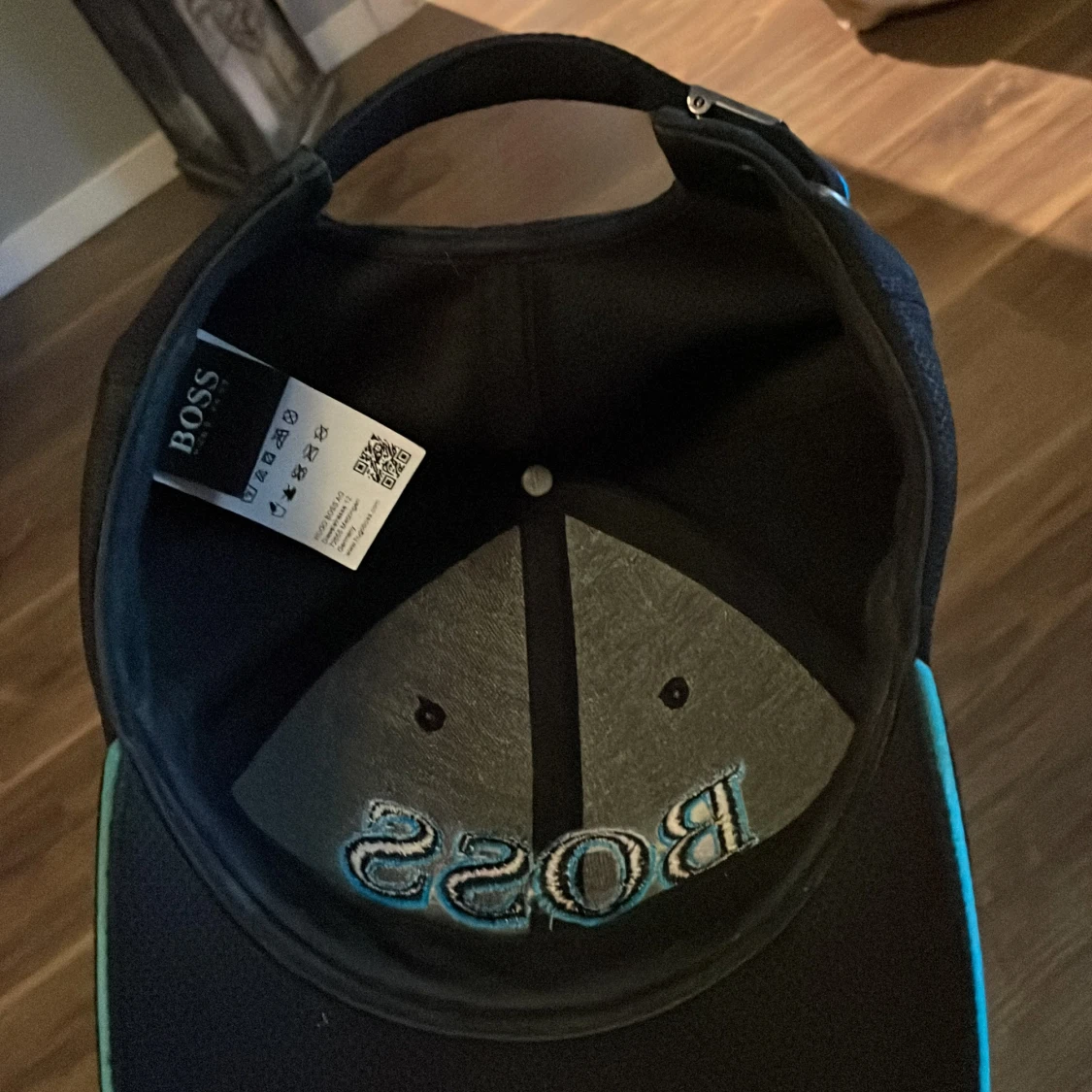 Svart keps från Hugo Boss med broderad logga i turkos framtill. Klassisk böjd skärm och justerbar rem baktill med metallspänne.