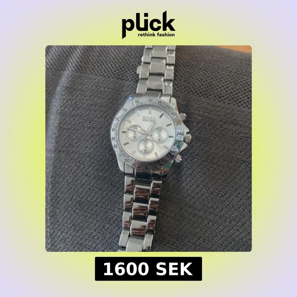Snygg och stilren silverfärgad klocka från Boss med kronograf och rostfritt stålarmband. Klockan har en klassisk urtavla med tre mindre sub-dials och en tydlig tachymeter på ringen. Perfekt för den som gillar en elegant och tidlös design. Den är oanvänd, helt ny! Vill sälja pga passar inte min smala hand