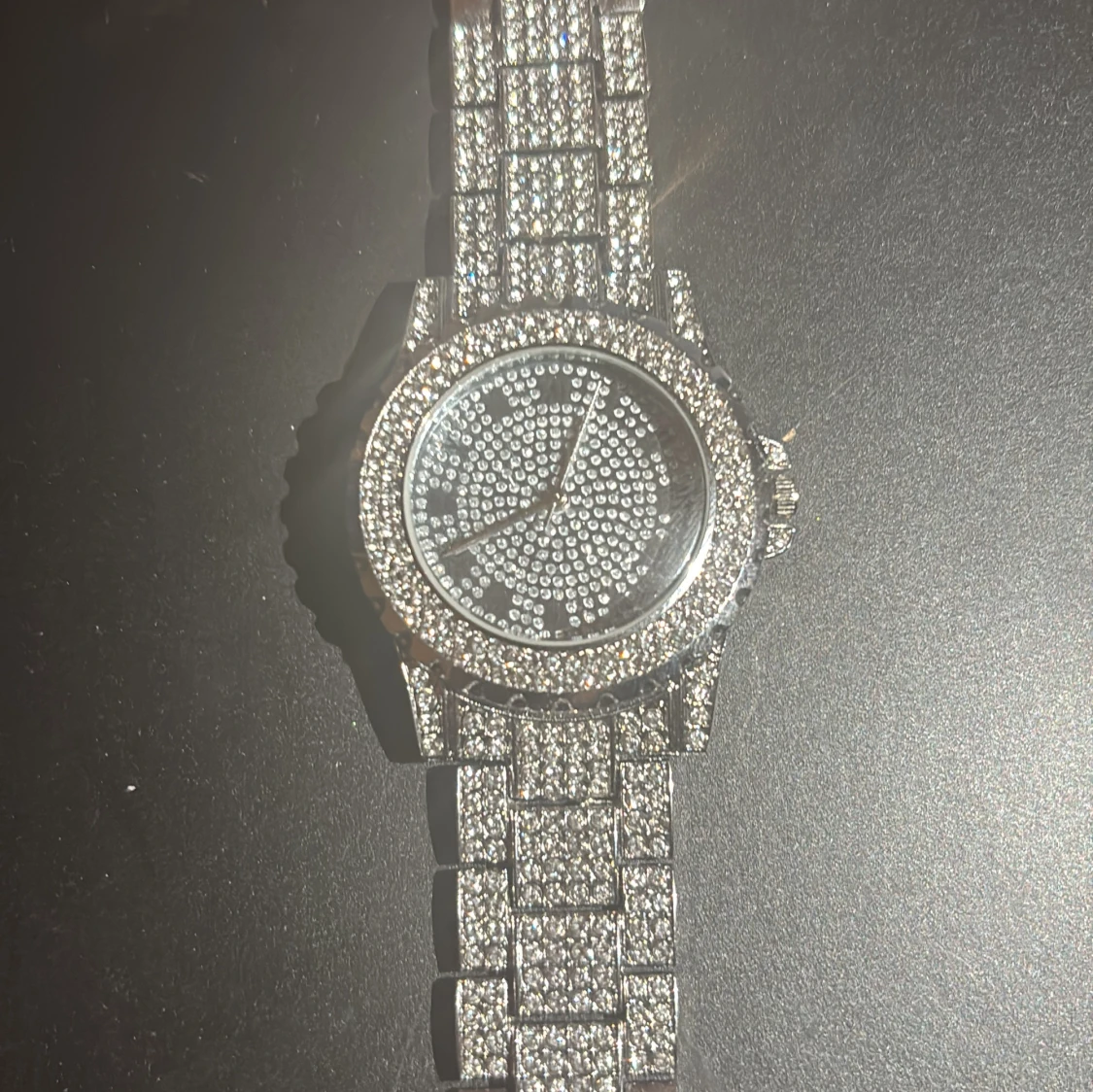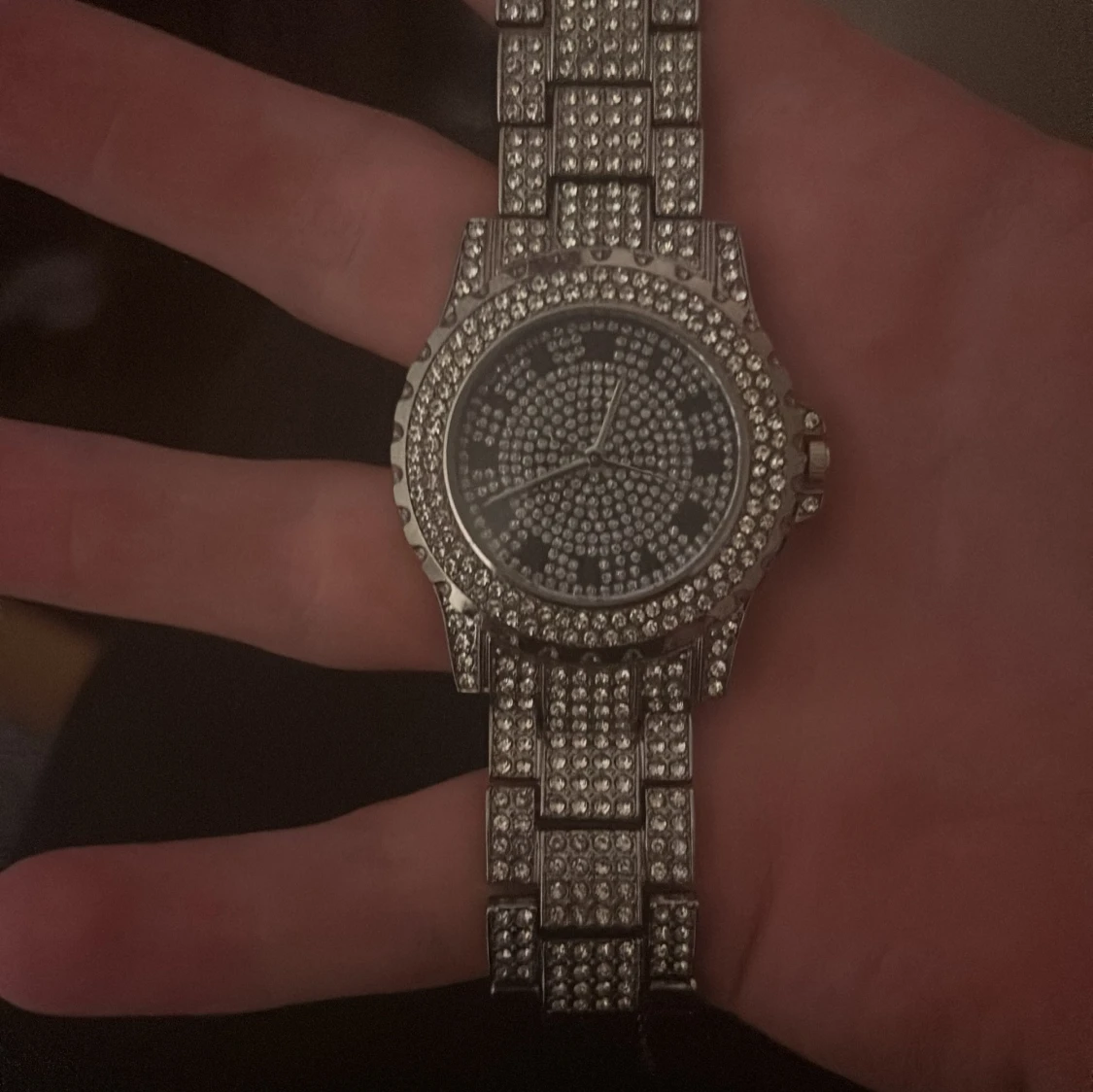 Säljer en riktigt blingad klocka i silverfärg med massor av glittrande stenar på både armband och urtavla. Klockan har romerska siffror och en chunky länkdesign som verkligen sticker ut. Perfekt för dig som vill ha en statement-accessoar som syns.