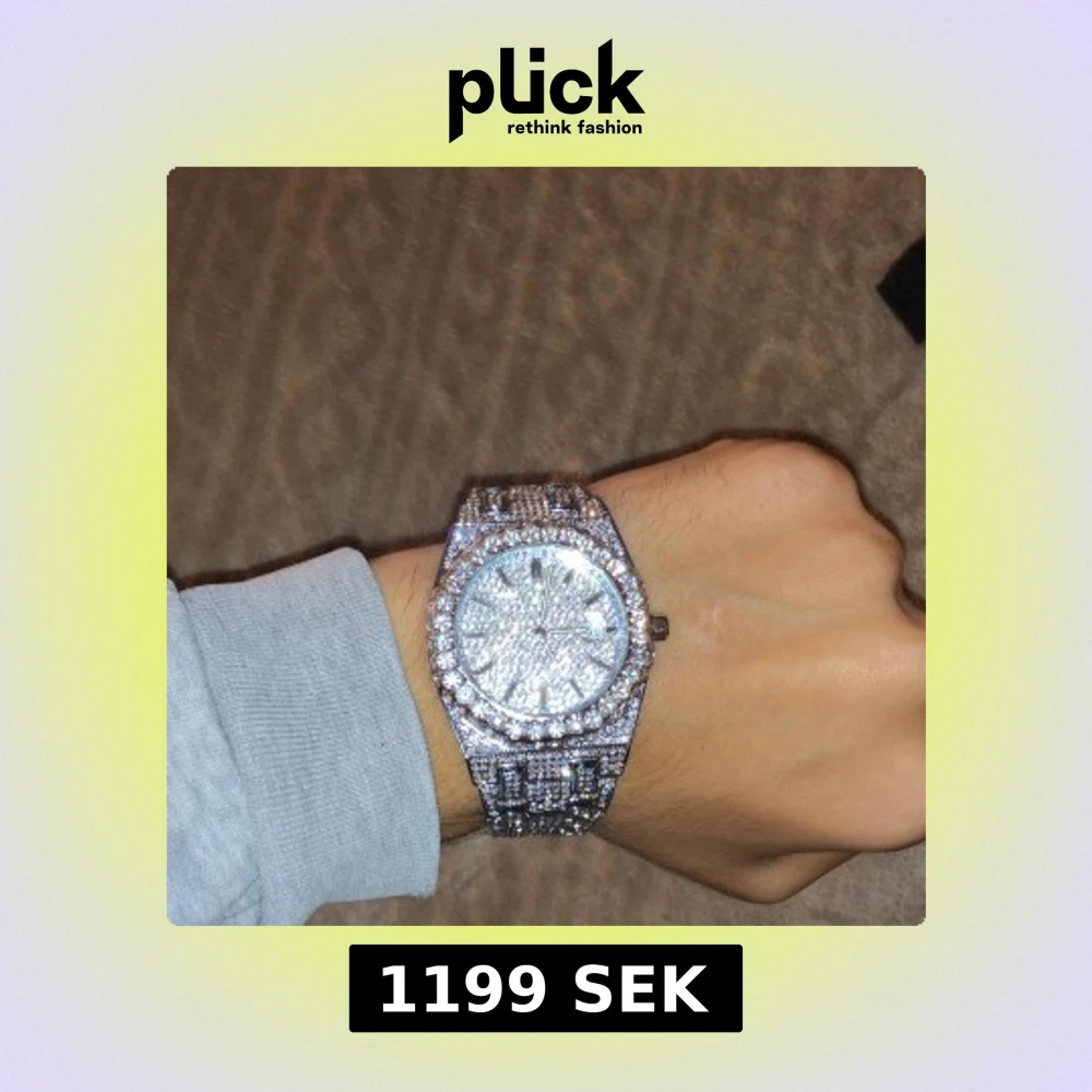 Säljer en riktigt blingad klocka i silverfärg med massor av gnistrande stenar över hela boetten, urtavlan och armbandet. Klockan har en klassisk rund form och datumvisning. Perfekt för dig som vill sticka ut och glänsa extra mycket.