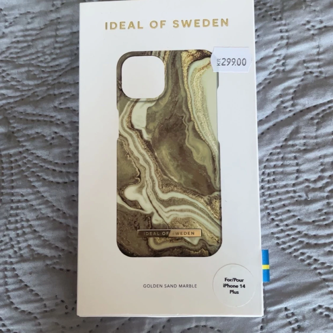 Snyggt mobilskal från iDeal of Sweden till iPhone 14 Plus med marmorerat mönster i beige, brunt och vitt. Skalets design heter Golden Sand Marble och har en lyxig känsla med gulddetalj. Perfekt för dig som vill ha en trendig och stilren look till mobilen.