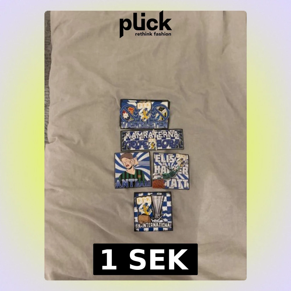 Samling med fem unika supporter pins för IFK Göteborg. Färgstarka motiv med blå, vit, grön och silver detaljer, inklusive text som 'Västkusten', 'Kamraterna Göteborg', 'Anti GAIS', 'Elis håller tätt' och 'IFK International'. Perfekt för dig som älskar fotboll och vill visa ditt lagstöd.