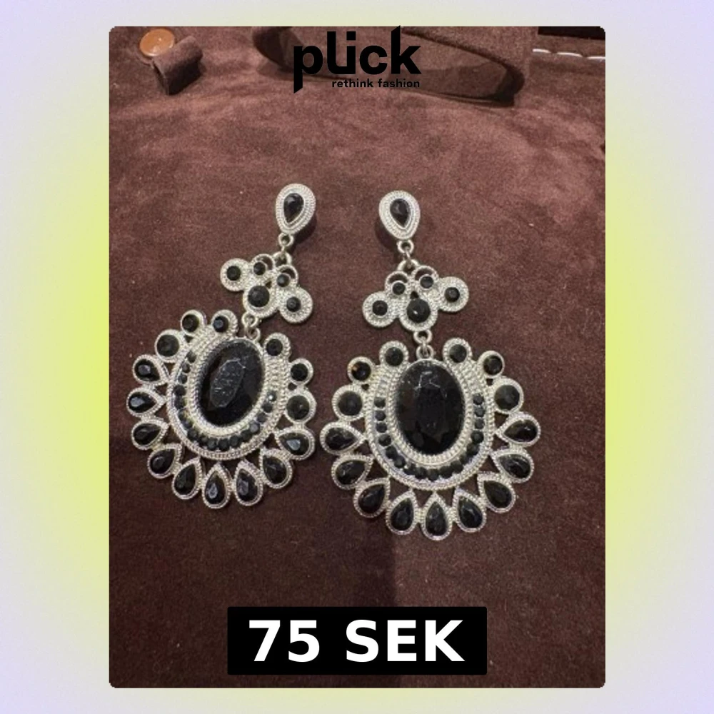 Säljer ett par riktigt snygga statementörhängen i silverfärg med svarta stenar. De har en droppformad design med massor av detaljer och gnistrande svarta stenar runt en stor oval mittsten. Perfekta för dig som vill sticka ut och addera lite edge till din look.