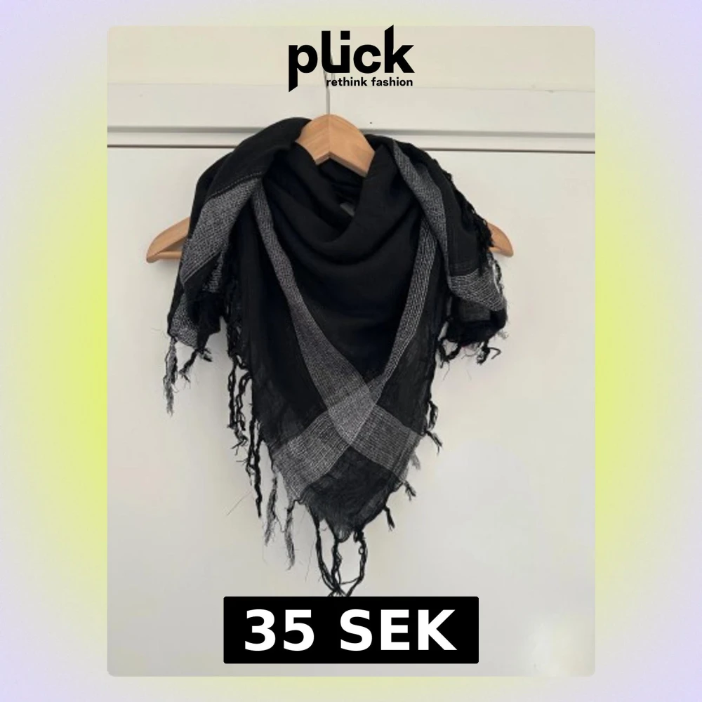 Snygg svart halsduk med grått rutmönster och fransar längs kanterna. Den är stor och fyrkantig, perfekt att svepa runt halsen eller använda som sjal. Materialet är tunt och vävt, vilket gör den lätt och luftig. Passar dig som gillar en cool och enkel stil.