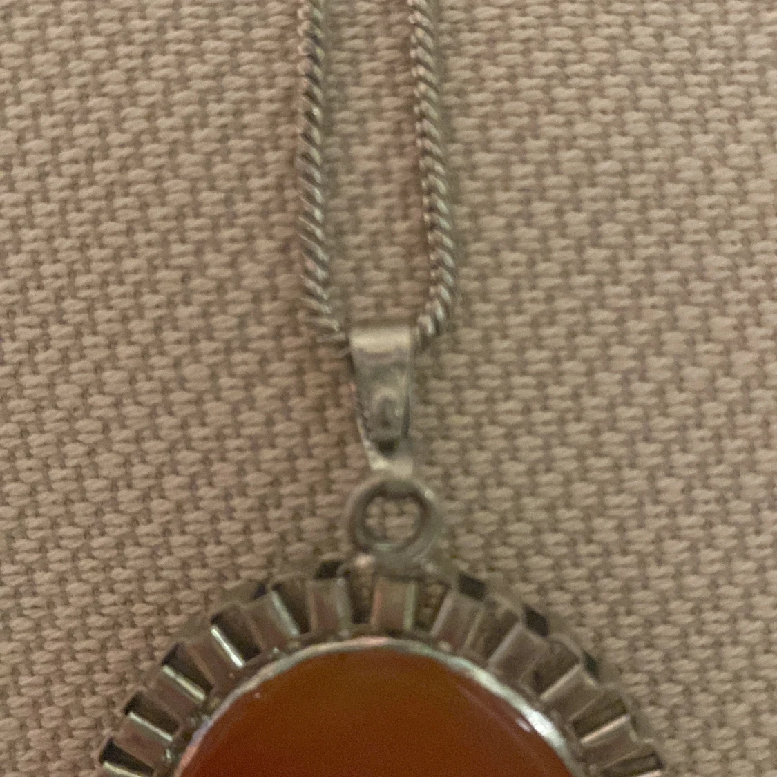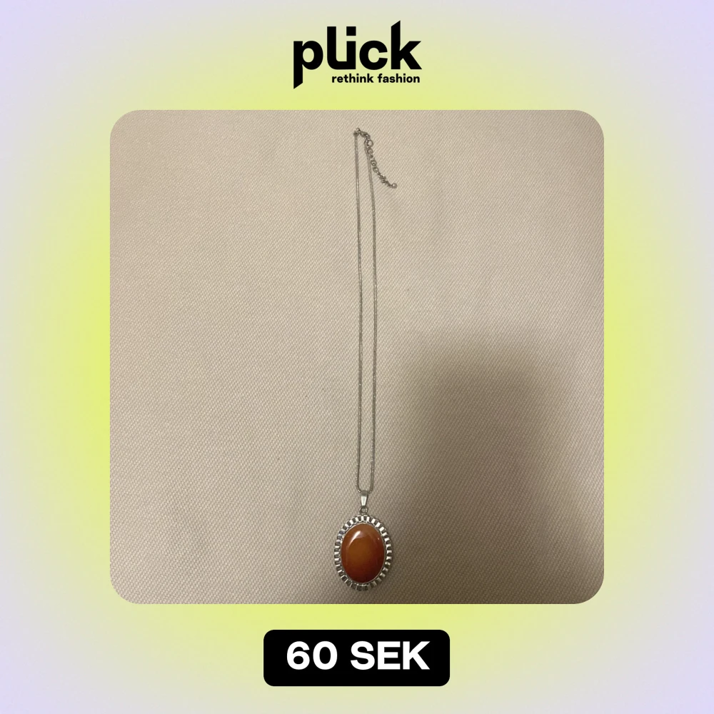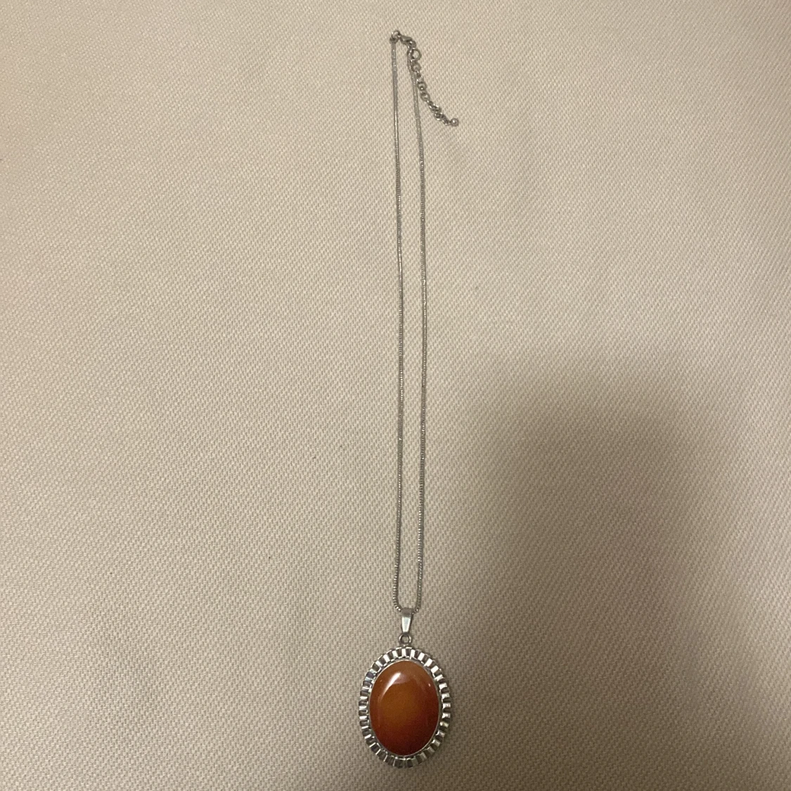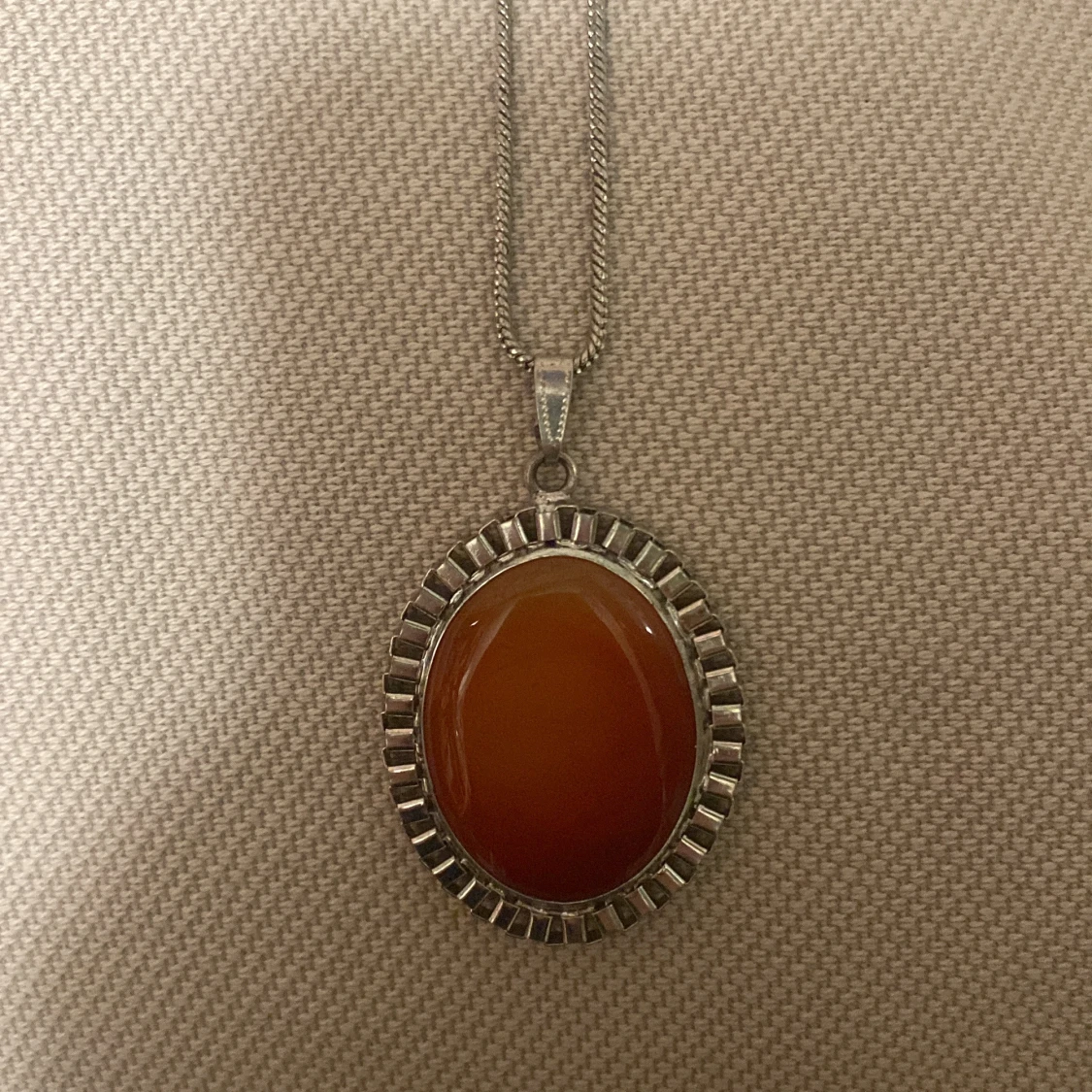 Säljer ett elegant silverhalsband med en stor oval orange sten i mitten. Stenen är omgiven av en detaljerad silverram som ger en vintagekänsla. Kedjan är tunn och stilren, vilket gör att hänget verkligen står ut. Perfekt för att ge en färgklick till din outfit!