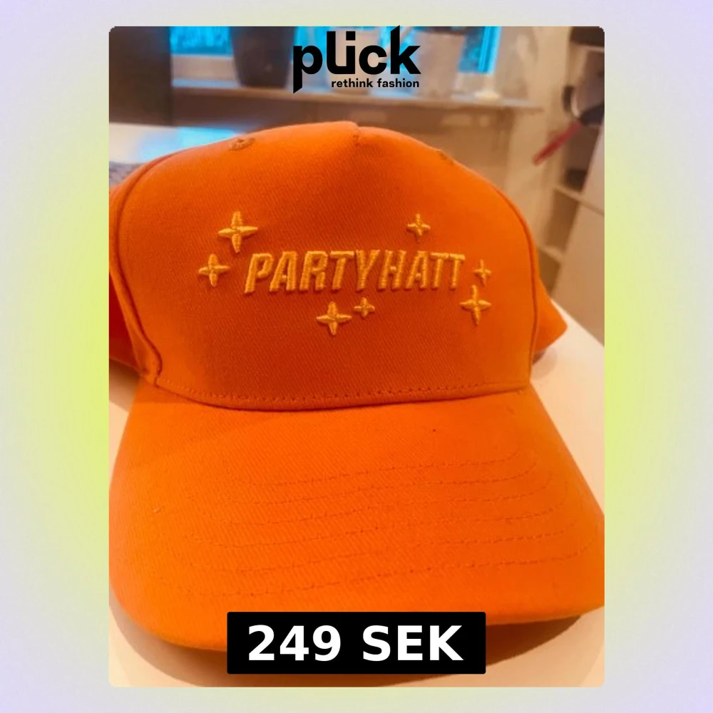 Säljer en riktigt cool orange keps med broderad text 'PARTYHATT' och glittrande stjärnor framtill. Kepsen har justerbar rem baktill med Ingo-logga. Perfekt för dig som vill sticka ut på nästa event! Har inte sett den på nätet där den går att köpa! ALDRIG ANVÄNT DEN!