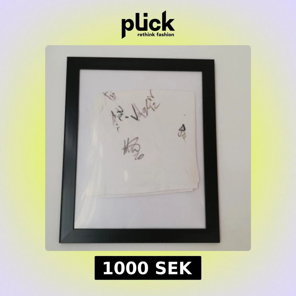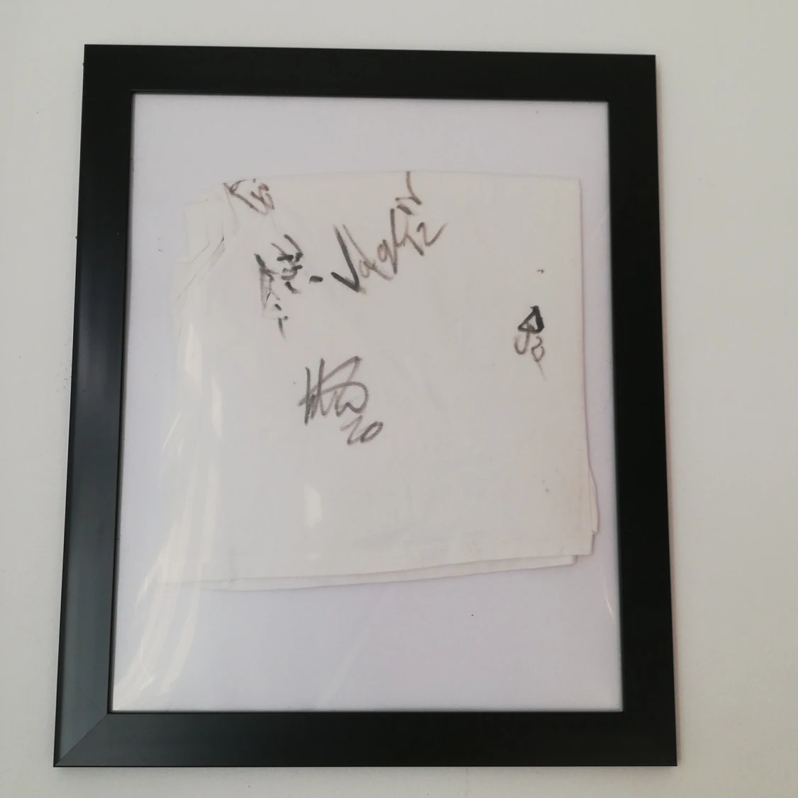 En vit tröja med flera autografer av häcken bk i svart bläck, inramad i en enkel svart ram med vit bakgrund. Perfekt för dig som gillar unika samlarprylar eller vill ha något personligt på väggen.