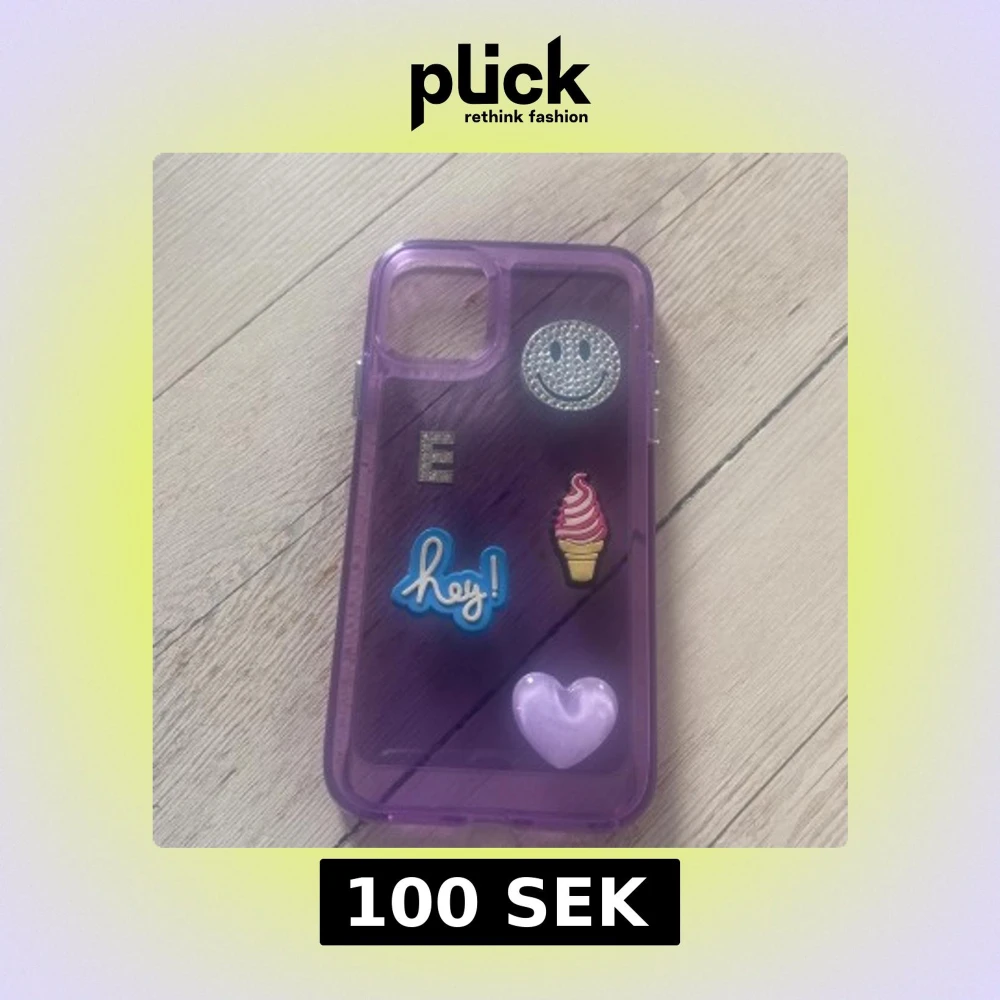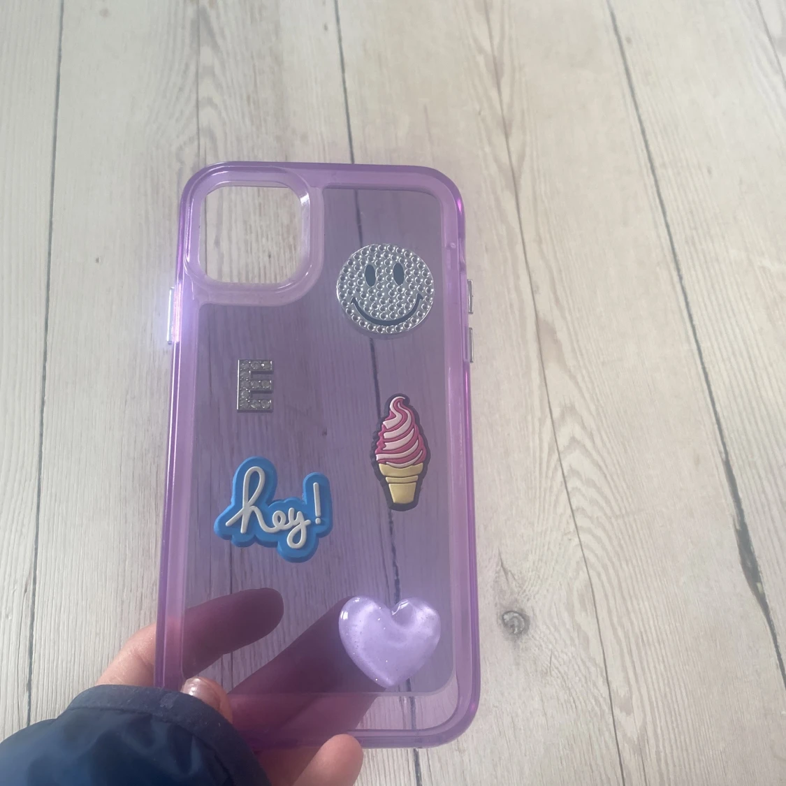 Lila mobilskal med block glass lila hjärta hej blå text :-) silvrig pärl smiley och ett silvrigt pärl E