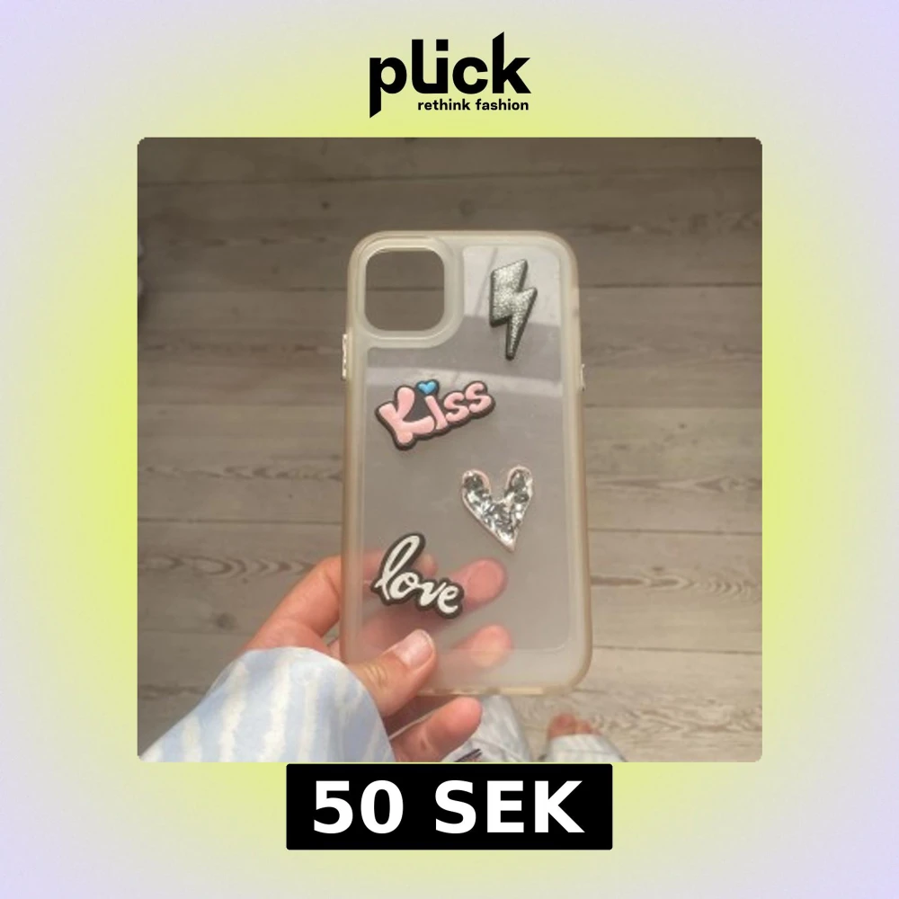 Säljer ett genomskinligt mobilskal med coola 3D-dekorationer: blixt, glittrigt hjärta, texten 'Kiss' i rosa och 'love' i vitt. Skalet har en mjuk beige ton och passar perfekt om du vill ha en personlig vibe på mobilen.