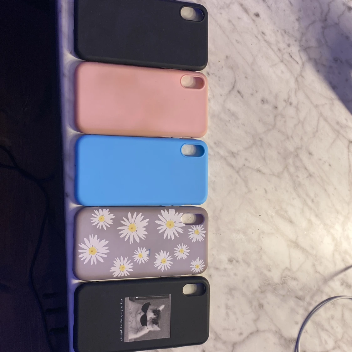 Skal till Iphone XS eller X. 50:- för alla. 4st av skalen är nästan oanvända utom det blommiga.