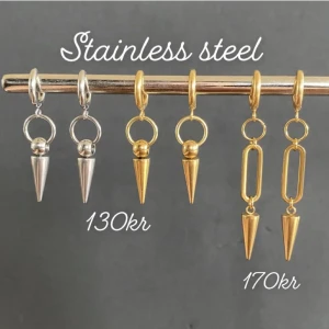 Örhängen med halsband  - Stilrena örhängen och halsband inspirerade av Maria Nilsdotter. Material-rostfritt stål. Örhängen längd-3,7cm, halsband längd-40cm. ☝️Vid köp ingår två extra berlocker som kan bytas ut, då själva hänget är ömtåligt och känsligt för stötar.