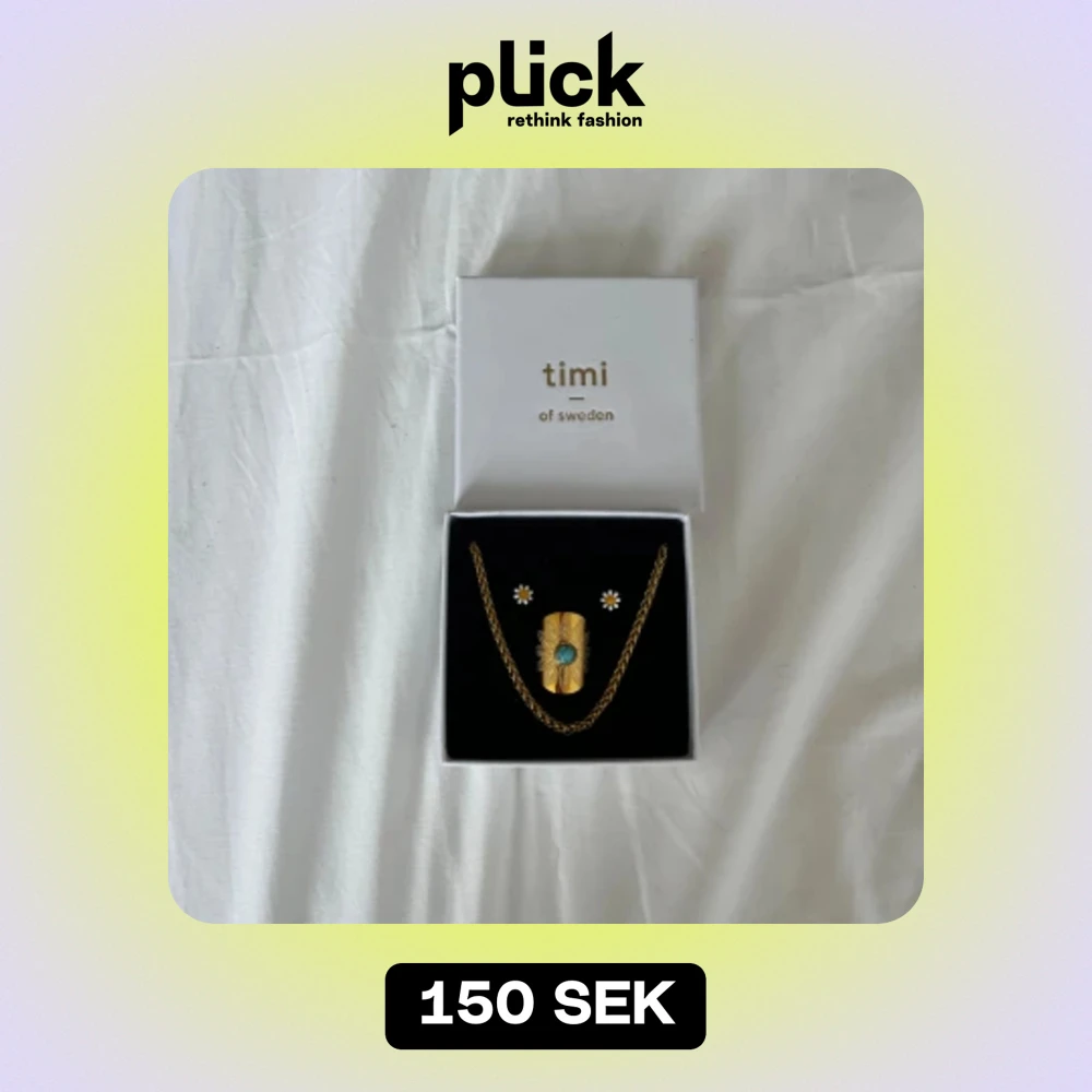 Ett halsband, ett par örhängen och en ring. Aldrig använt och har kvar original förpackningen. Jätte fint till sommaren.
