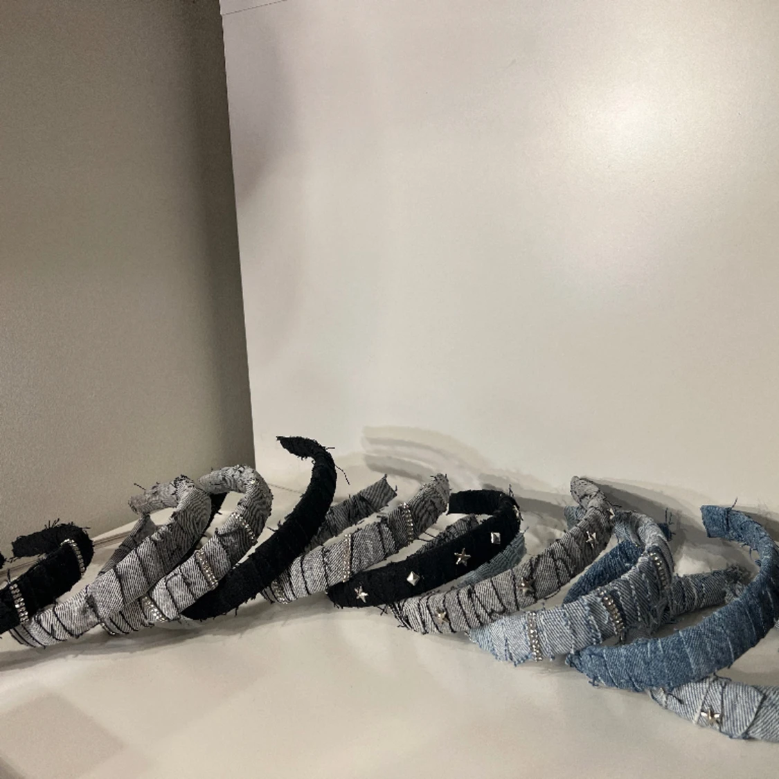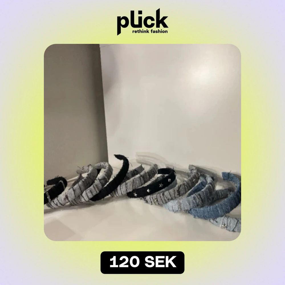 Snygga diadem i återvunnet jeans ifrån @hairjourneyuf. Säljs som vanliga jeans, med kvadratnitar, stjärnnitar och med strass. Färgerna är tillfälliga då vi använder återvunnet tyg, detta betyder att nästa släpp kommer de annorlunda ut. Obs 120 kr/st
