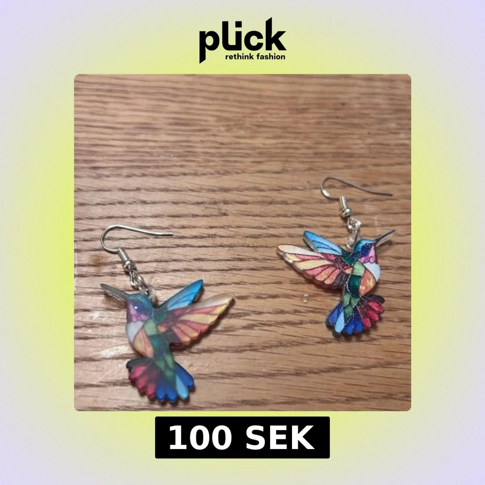 Unika örhängen i form av kolibrier med färgglada detaljer i blått, rosa, grönt, rött och gult. Lätta och iögonfallande med silvriga krokar. Perfekta för dig som vill sticka ut med ett lekfullt och konstnärligt smycke.