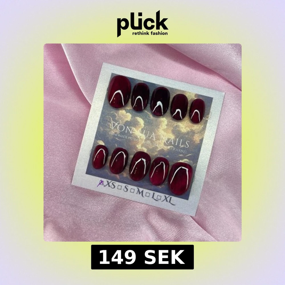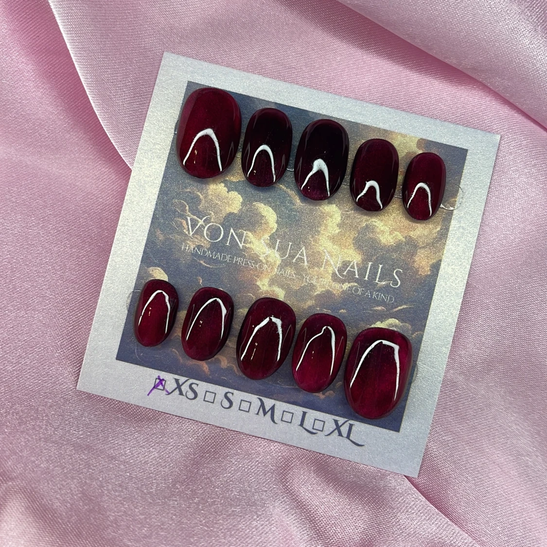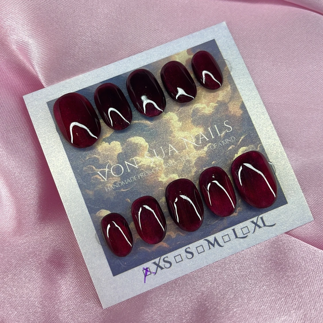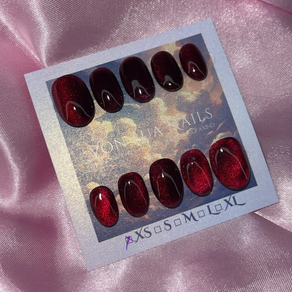 Snygga handgjorda press-on naglar i en djup röd cateye färg med glansig finish och magnetisk. Extra korta Ovala form, perfekta för att snabbt fixa en trendig look. Kommer i XS: 14 mm, 11 mm, 11,5 mm, 10 mm, 8 mm
