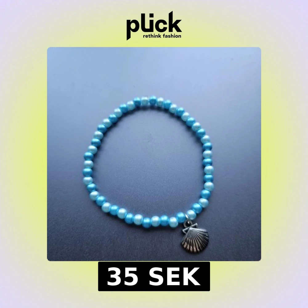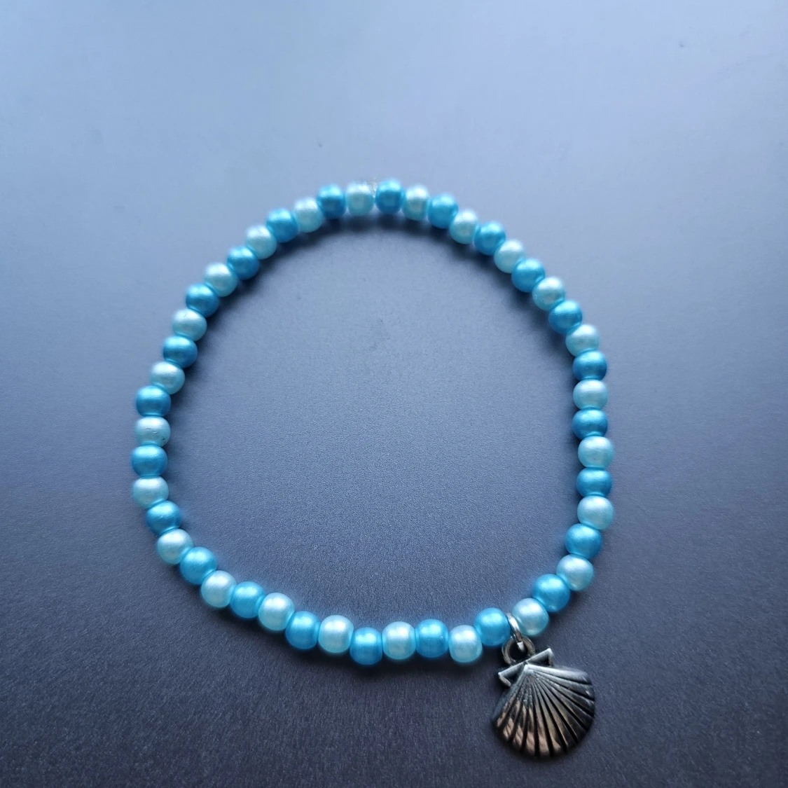 Superfint armband med små blå pärlor och en silverfärgad snäckformad berlock.