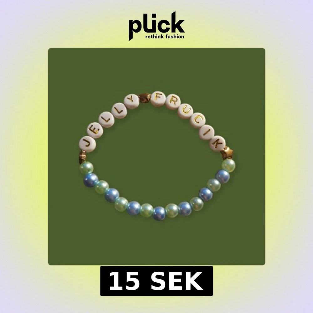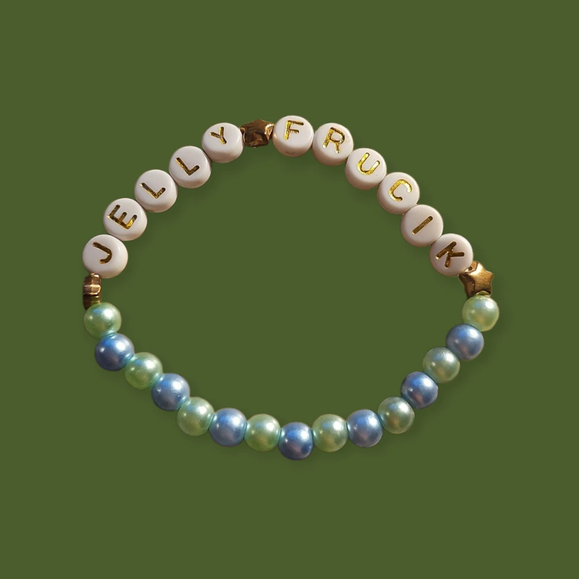 Armband med pärlor i blått och grönt samt vita bokstavspärlor som bildar texten 'JELLY FRUCIK'. Två små guldstjärnor ger extra detalj.
