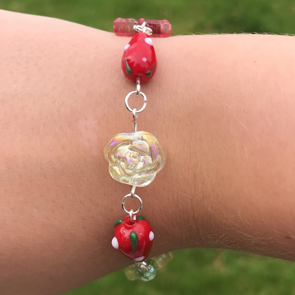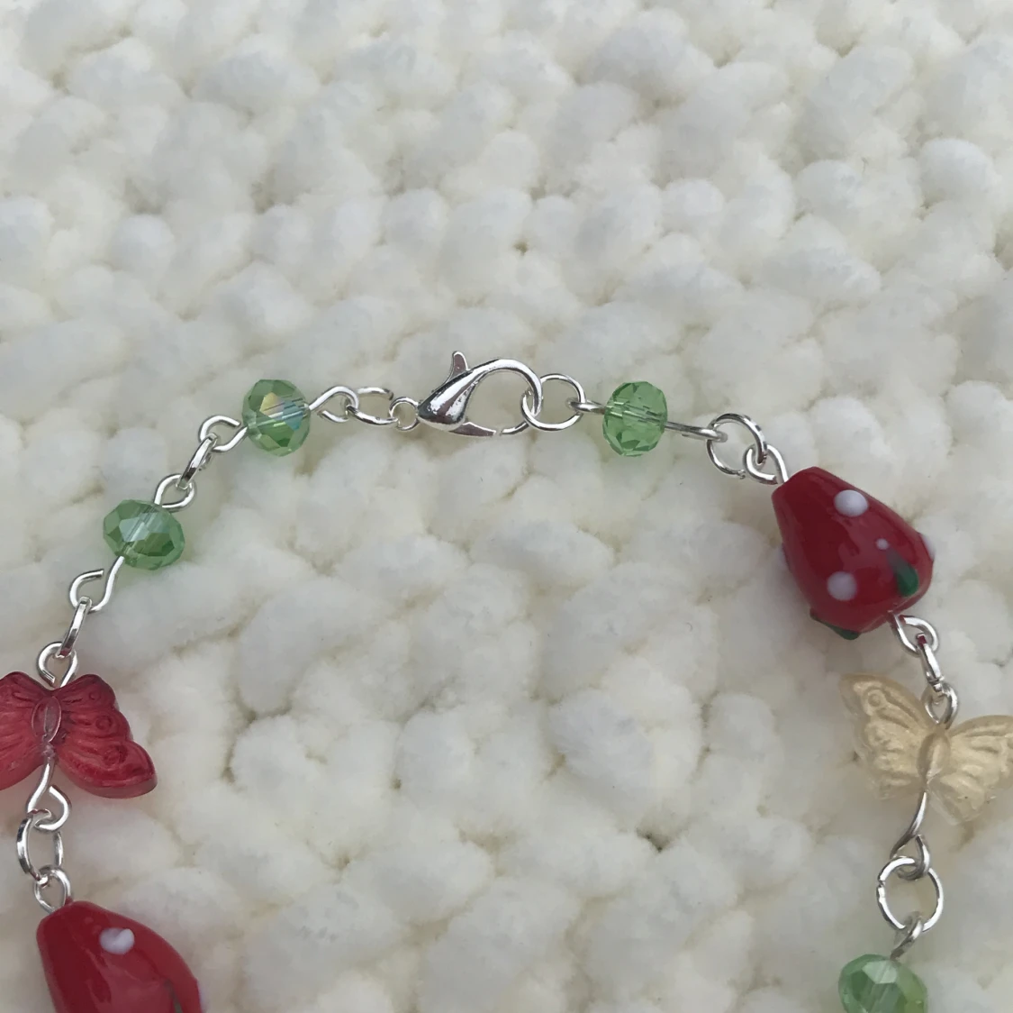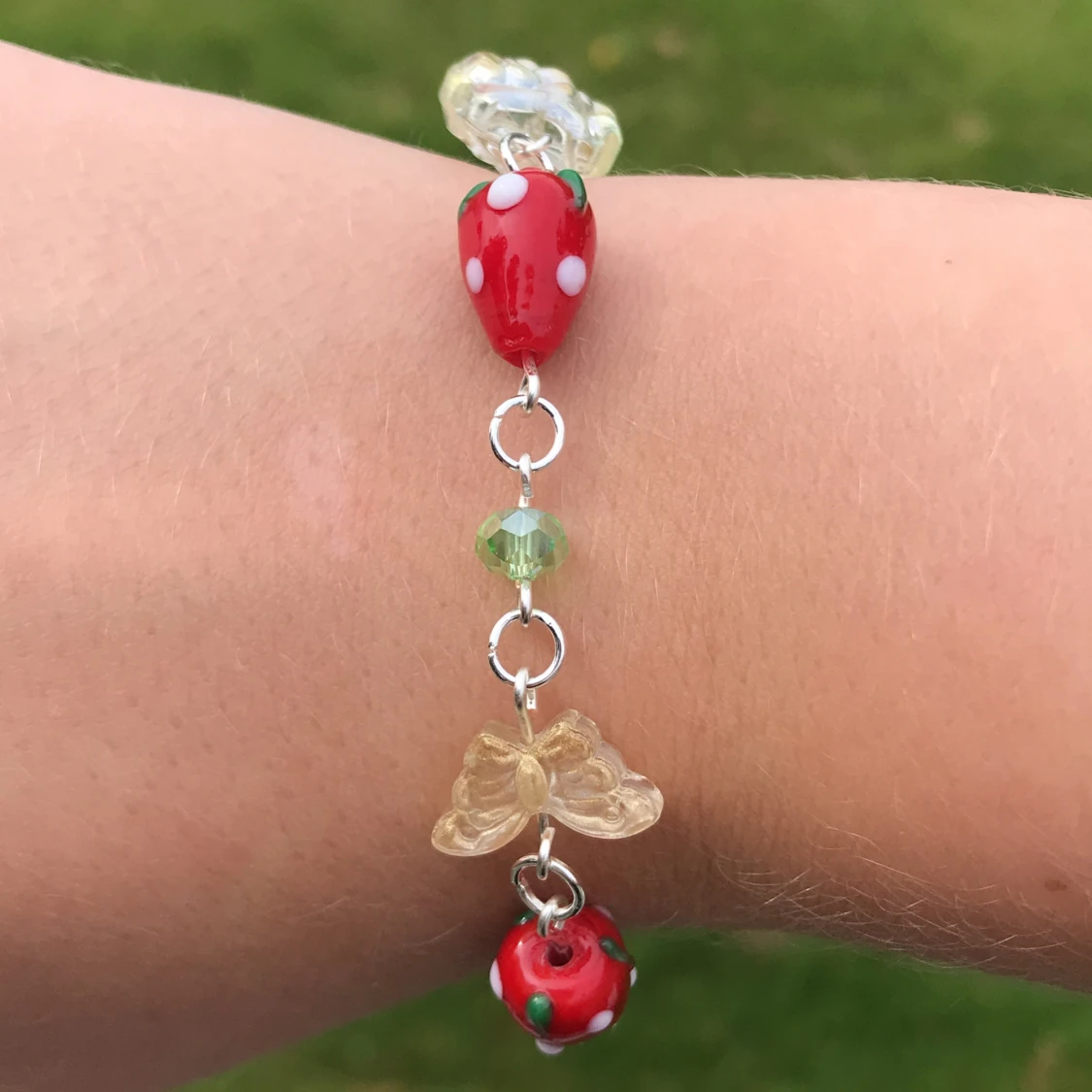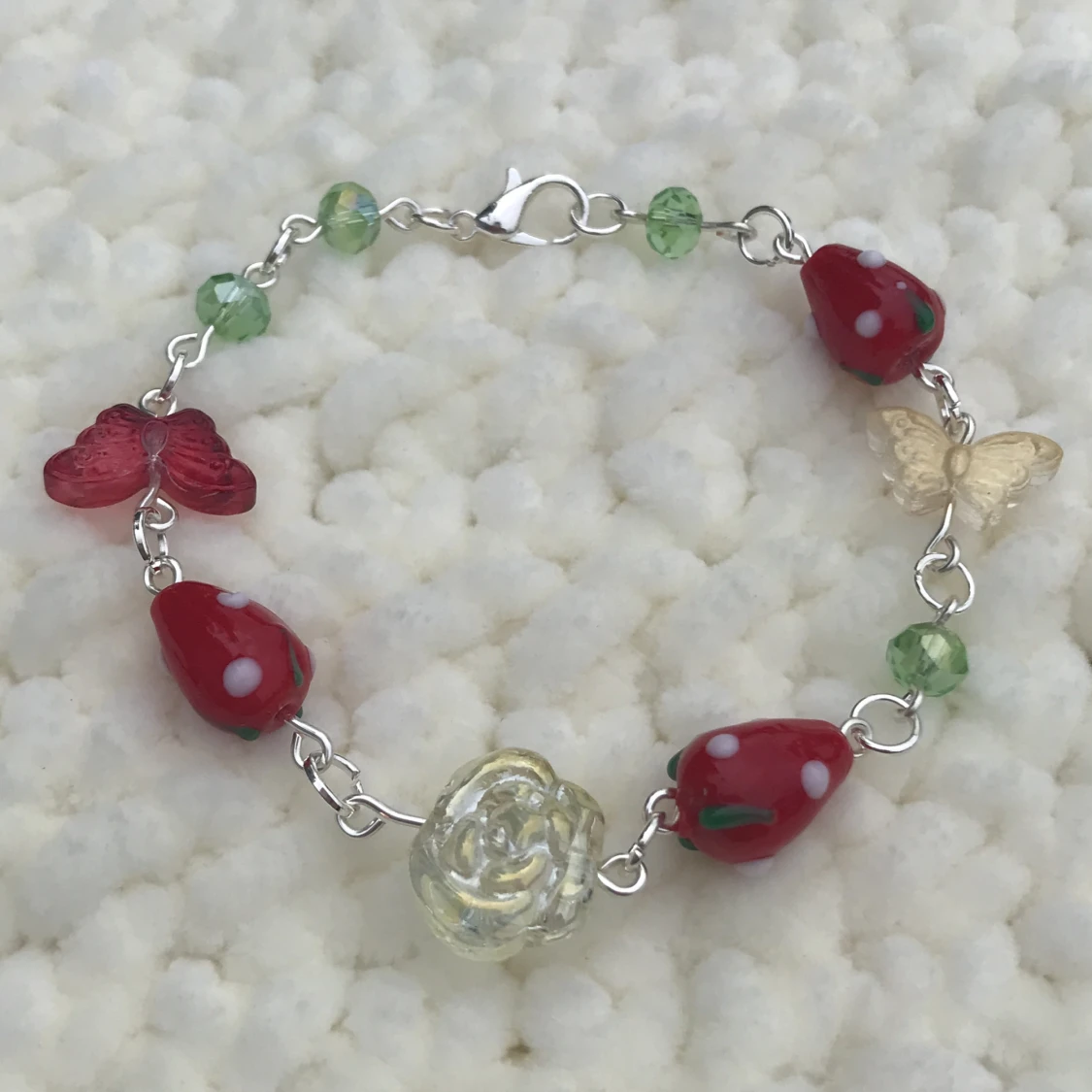Vackert jordgubbs armband av blandade glaspärlor och silveromfattning🍓🫐🪷🦋