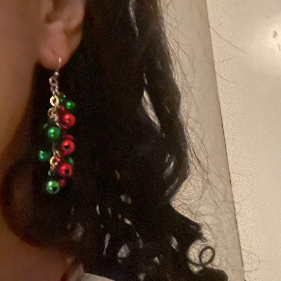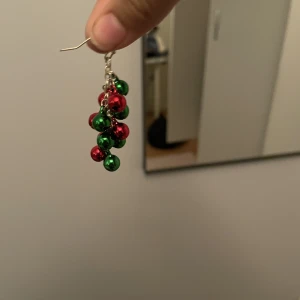 grönröda julörhängen köpta på glitter för 1 år sedan. som man ser på bild 3 så är de tyvärr för tunga för mina öron så de är aldrig använda. det är bjällror i dem så de låter alltså när man rör på öronen❤️