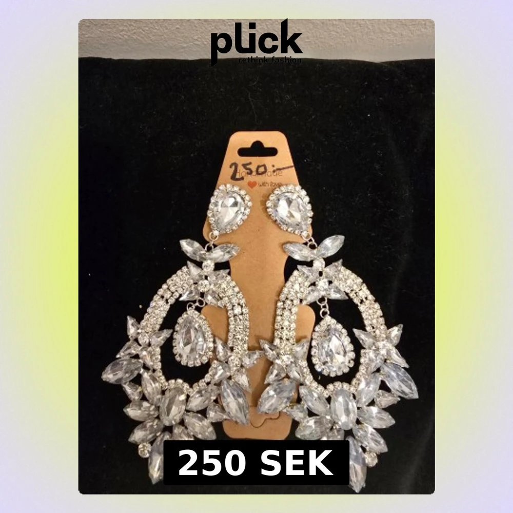 Bilden visar ett par stora, glittriga örhängen med många klara stenar i olika former, men ingen väst finns med på bilden.