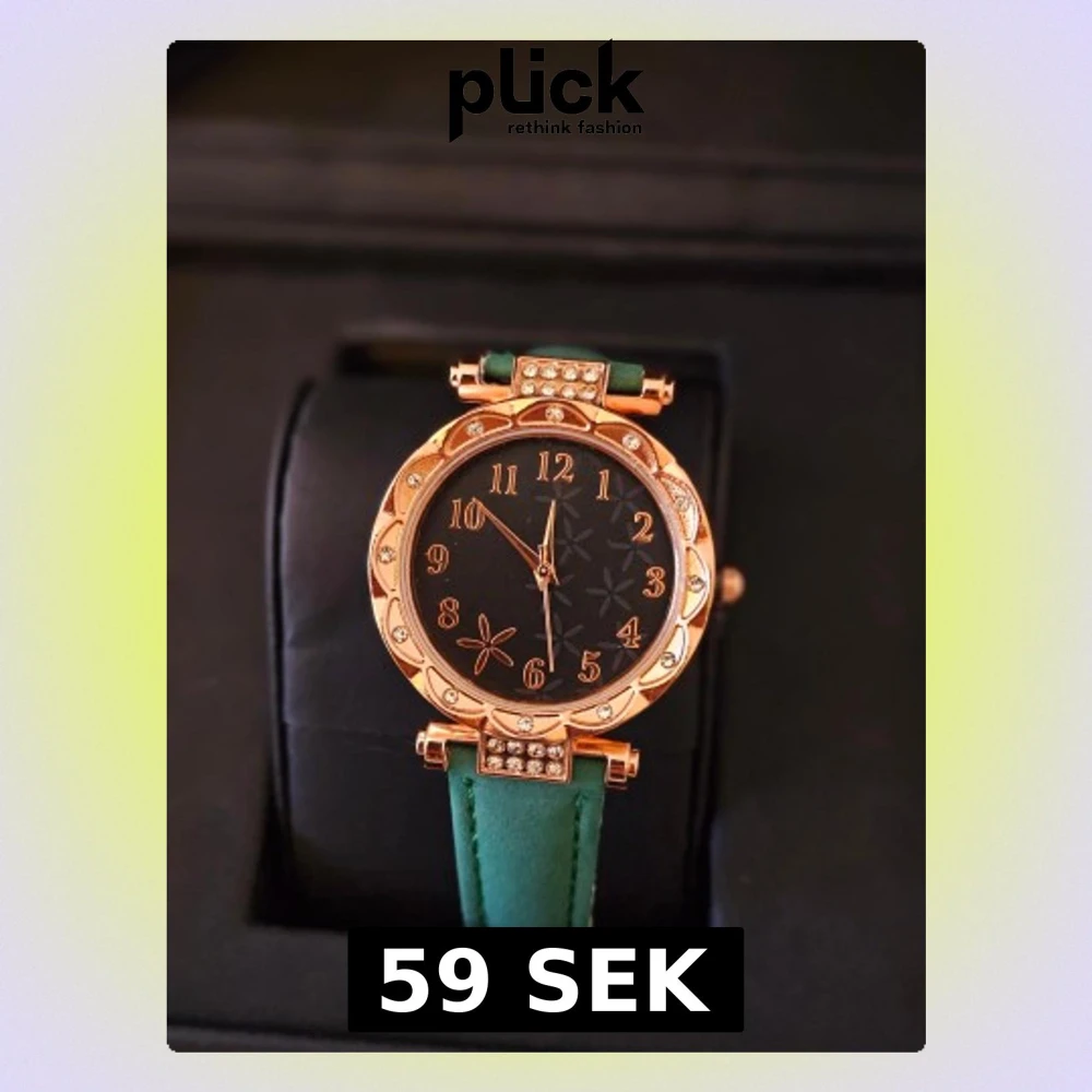 Snygg klocka med grönt band och roséguldfärgat ur med strassdetaljer runt boetten. Svart urtavla med blommönster och siffror i guld. Bandet är grönt på ovansidan och beige på undersidan, med klassiskt spänne i silver. Perfekt accessoar för att lyfta din stil.