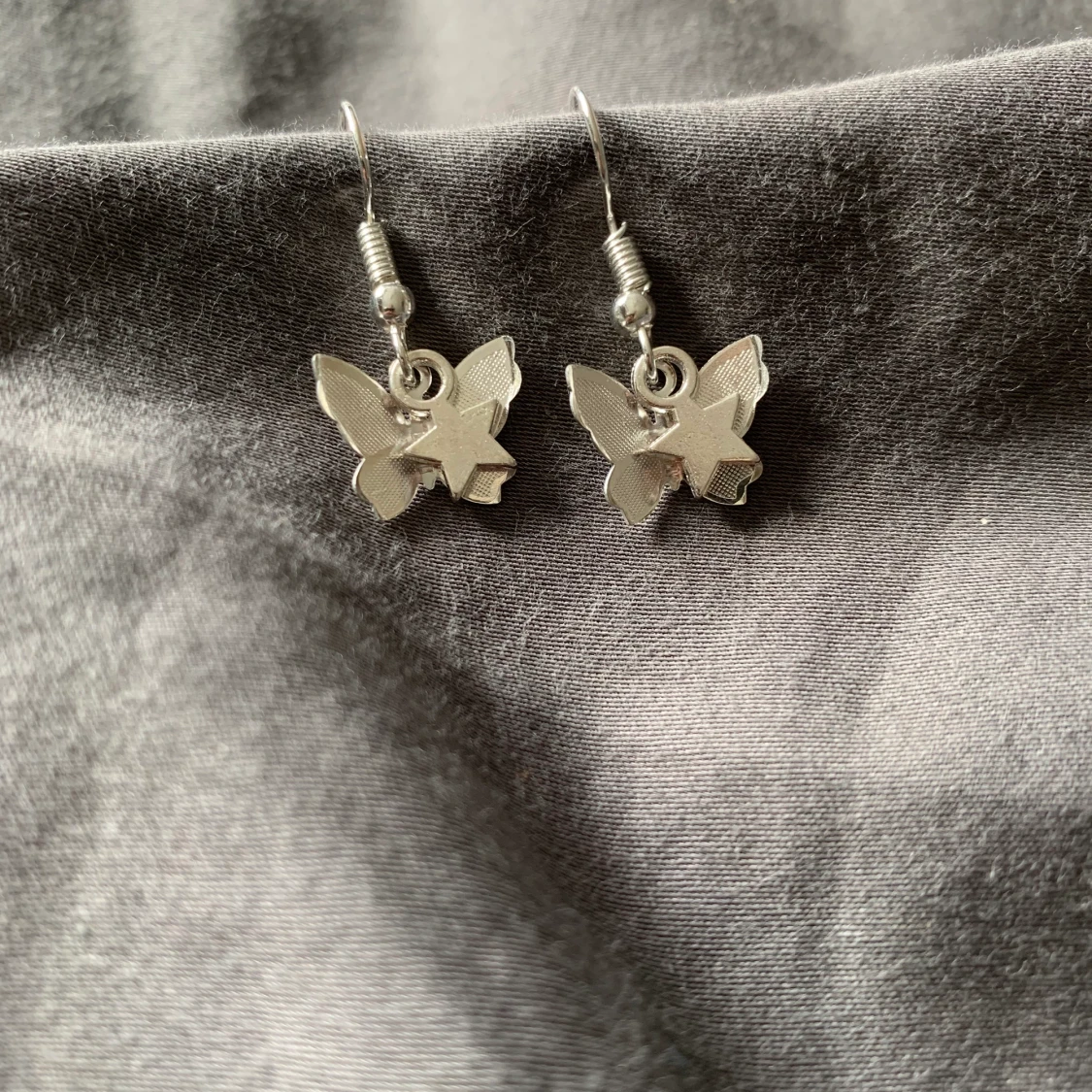 Dessa är ett par örhängen jag har tillverkat av nickelfria silvriga örhängens krokar, och de har helt oanvända som min andra smycken!