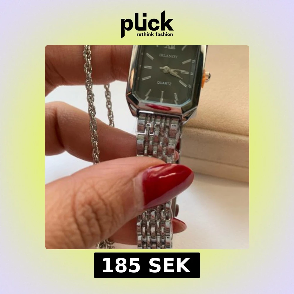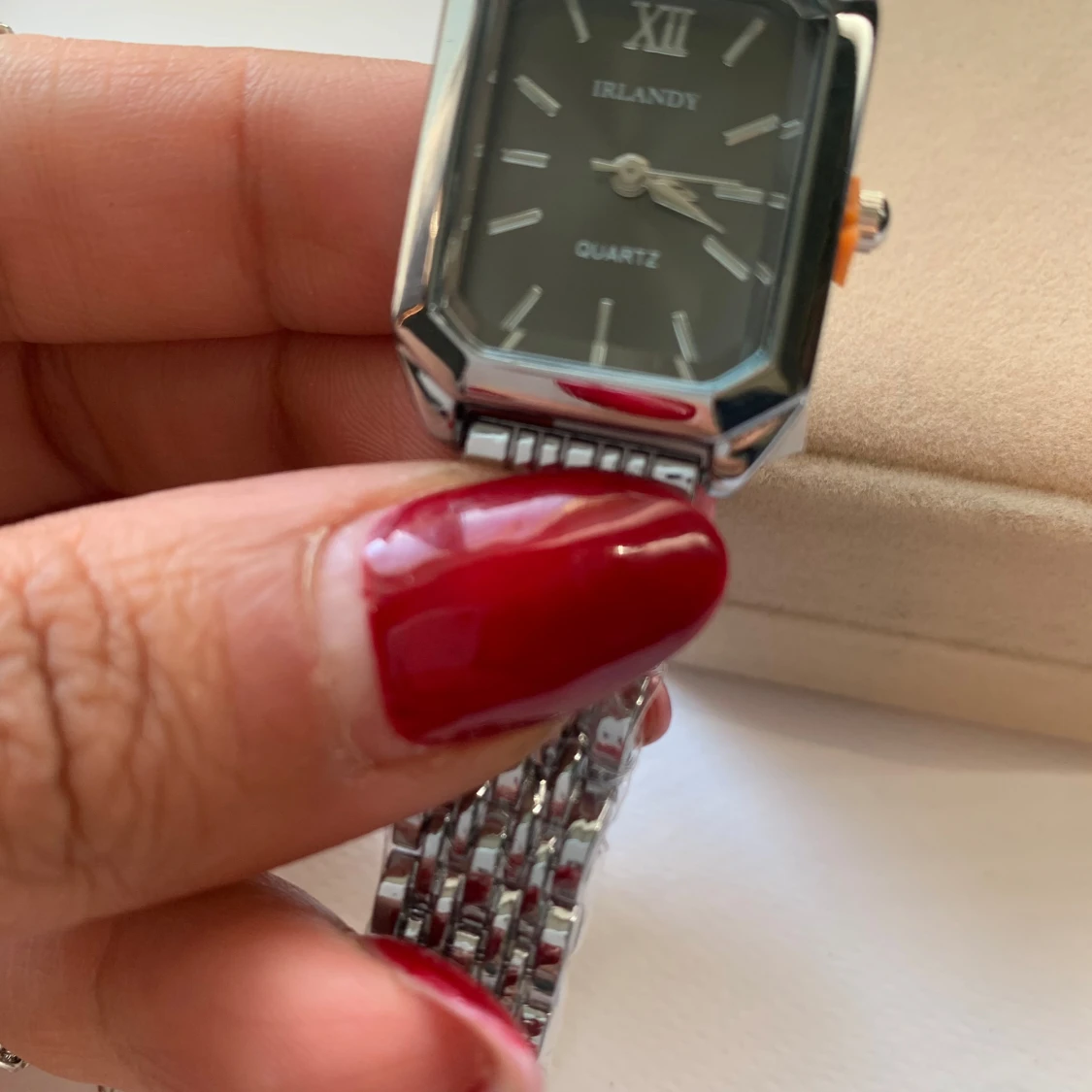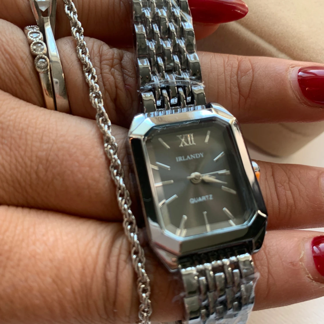 Stilren klocka från Irlandy med rektangulärt svart urtavla och silverfärgad länk i metall. Klockan har tydliga indexmarkeringar och romersk tolvmarkering. Klassisk design som passar till många stilar.