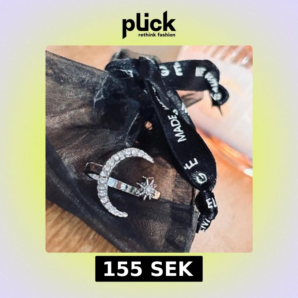 Justerbar statement-ring för kvinnlig kraft och energi i sterlingsilver med månskära och stjärna fattade med cubic zirkonia-stenar. Oanvänd. Månen symboliserar ofta kvinnlighet och förknippas med intuition, styrka & emotionellt djup. Stjärnor är nära förknippade med vägledning, inspiration och drömmar.