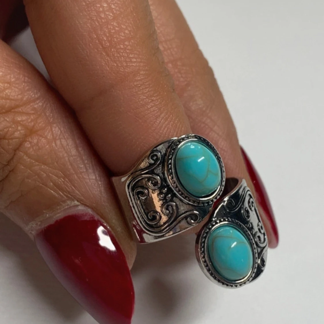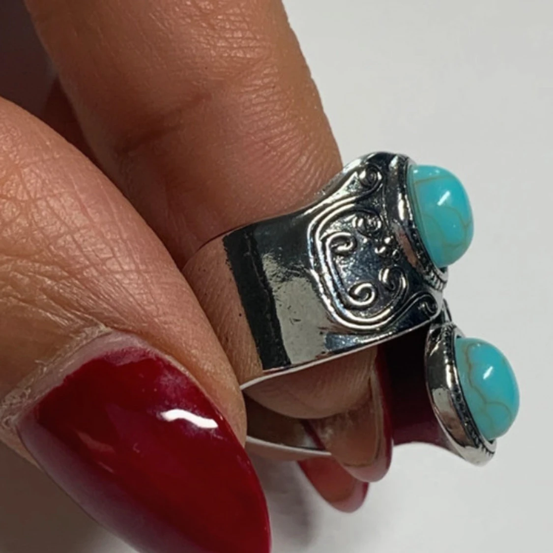 Unik silverfärgad ring med två ovala turkosa stenar och detaljerade snirkliga mönster på sidorna. Ringen har en cool, bohemisk vibe och är perfekt för dig som gillar statement-smycken. Stenarna har en snygg ljusblå ton med naturliga marmoreringar.