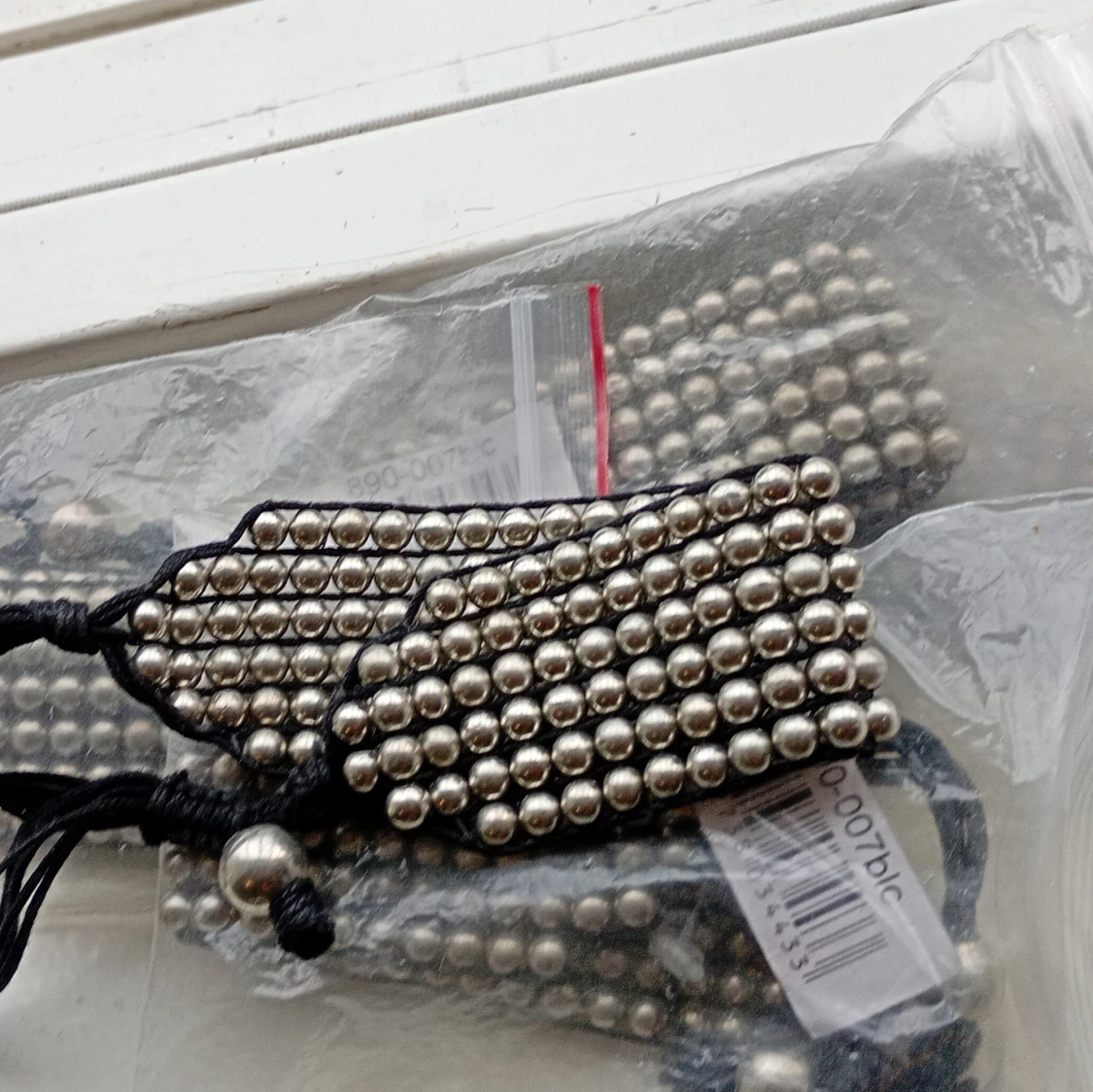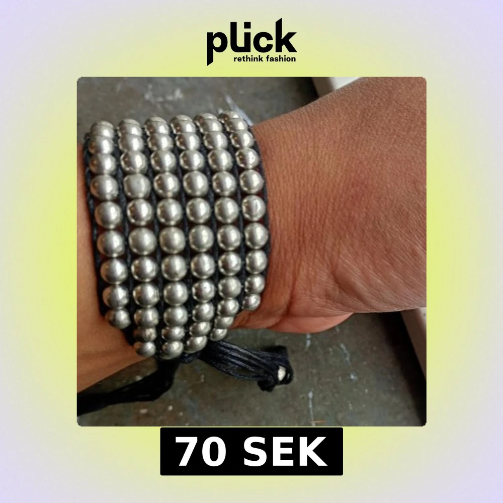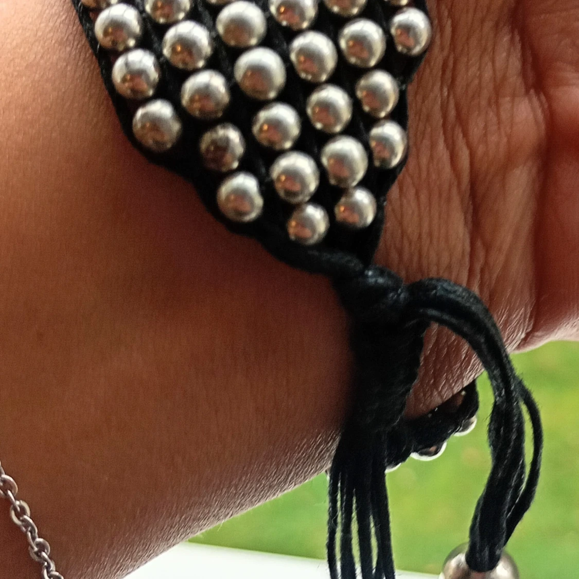 Säljer ett brett armband med flera rader silverfärgade pärlor på svart snöre. Armbandet har justerbar knytning och en cool, chunky look som sticker ut. Perfekt för dig som gillar att addera lite edge till din stil.