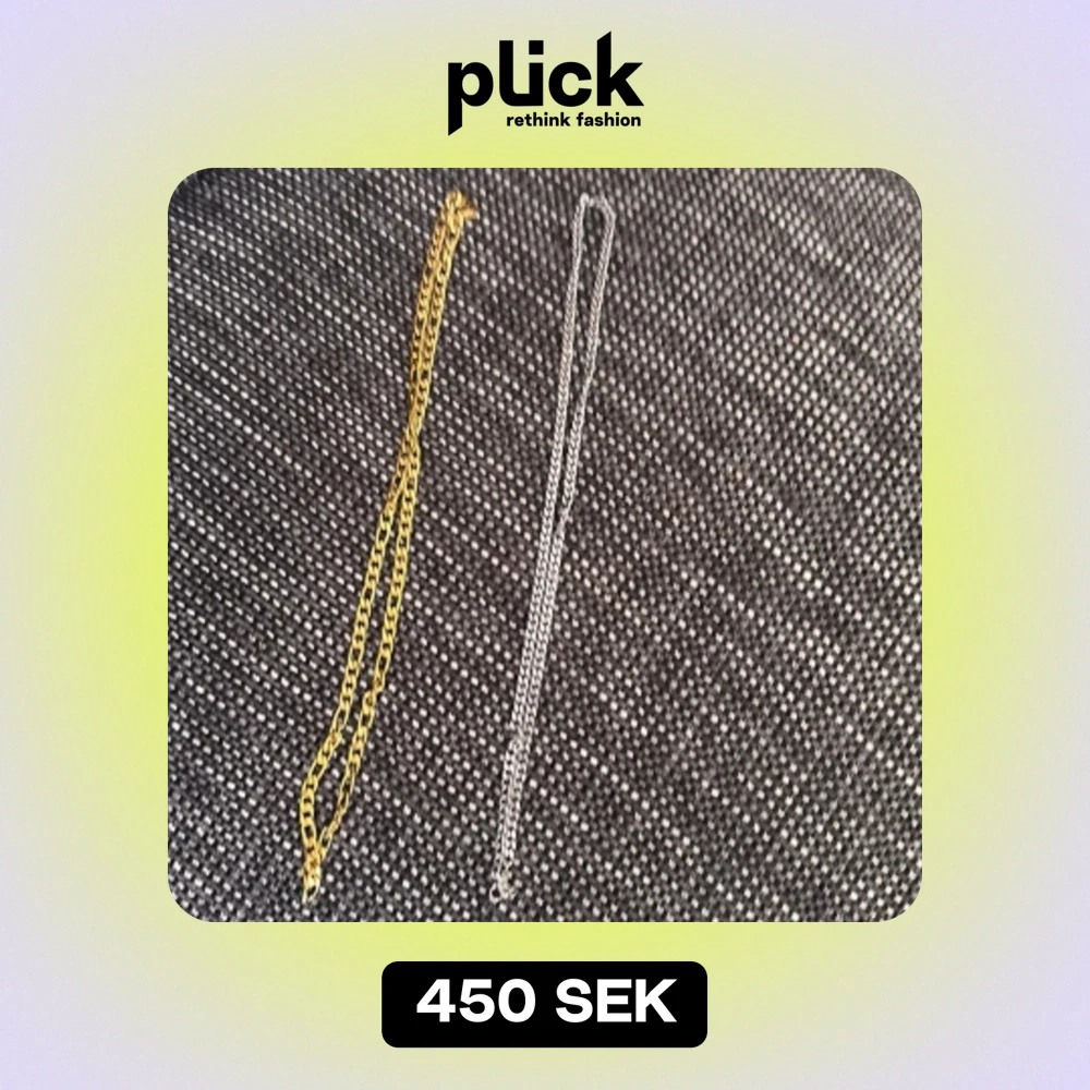 Silver halsbandet är rostfritt stål ny pris är 350kr, säljer för 200kr, guld halsbandet är också rostfritt stål ny pris på guld halsbandet är 450kr, säljer för 250kr, för båda 450kr. Silver är 55cm lång, guld är 55cm lång och 6mm bred
