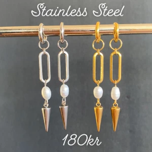 Örhängen med halsband  - Stilrena örhängen och halsband inspirerade av Maria Nilsdotter. Material-rostfritt stål. Örhängen längd-3,7cm, halsband längd-40cm. ☝️Vid köp ingår två extra berlocker som kan bytas ut, då själva hänget är ömtåligt och känsligt för stötar.