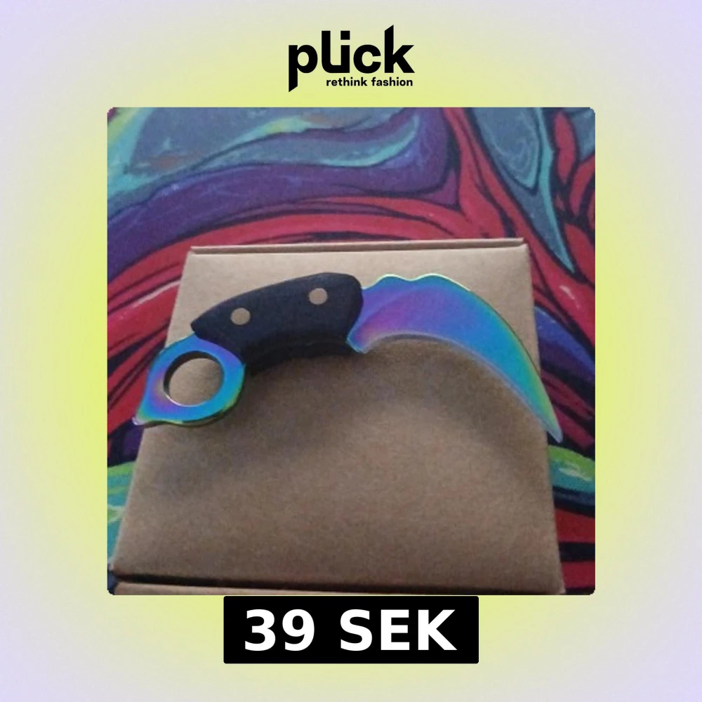 Unik karambit-kniv med regnbågsfärgad böjd klinga och svart handtag. Perfekt för samlare eller cosplay. Kniven ser oanvänd ut och har inga synliga repor eller skador. Levereras i originalförpackning.