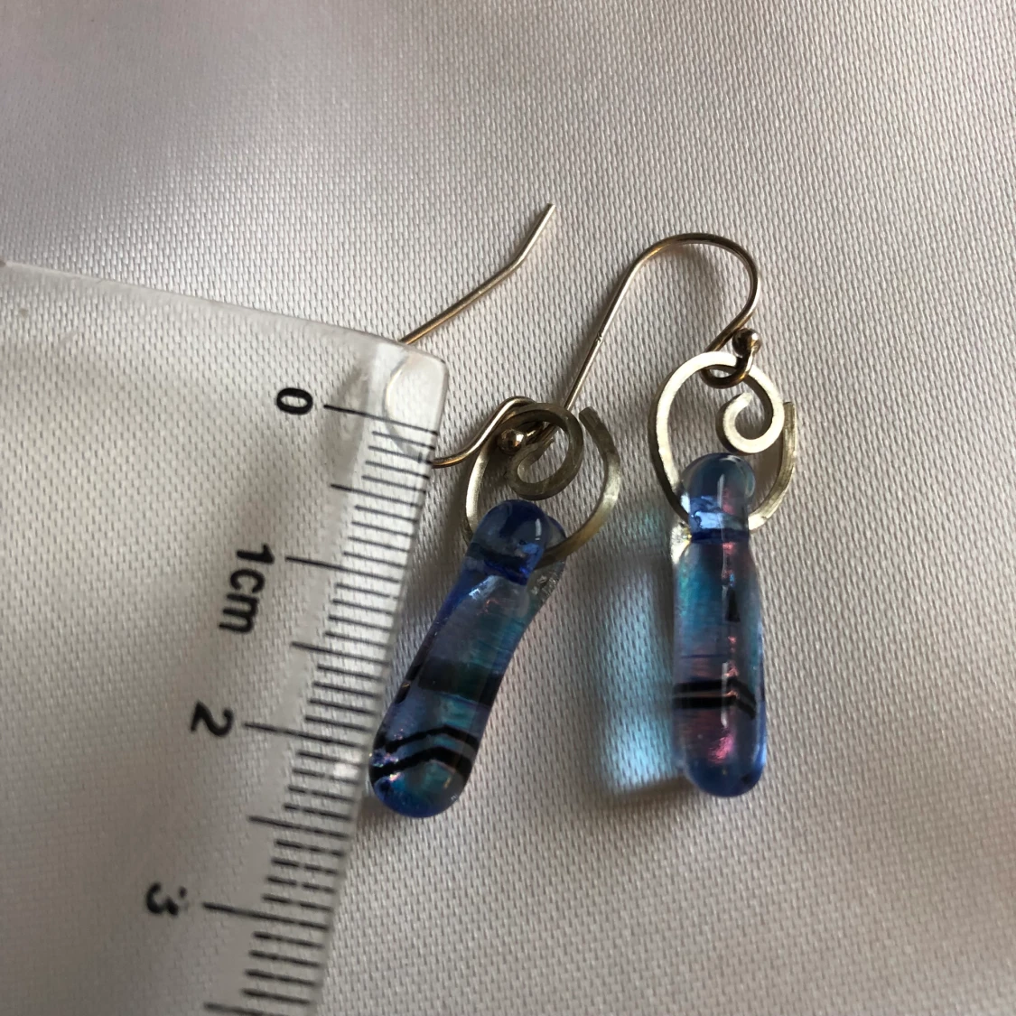 Handgjorda örhängen i silver (925) och glas. Ca 2.5 cm långa. Aldrig använda.
