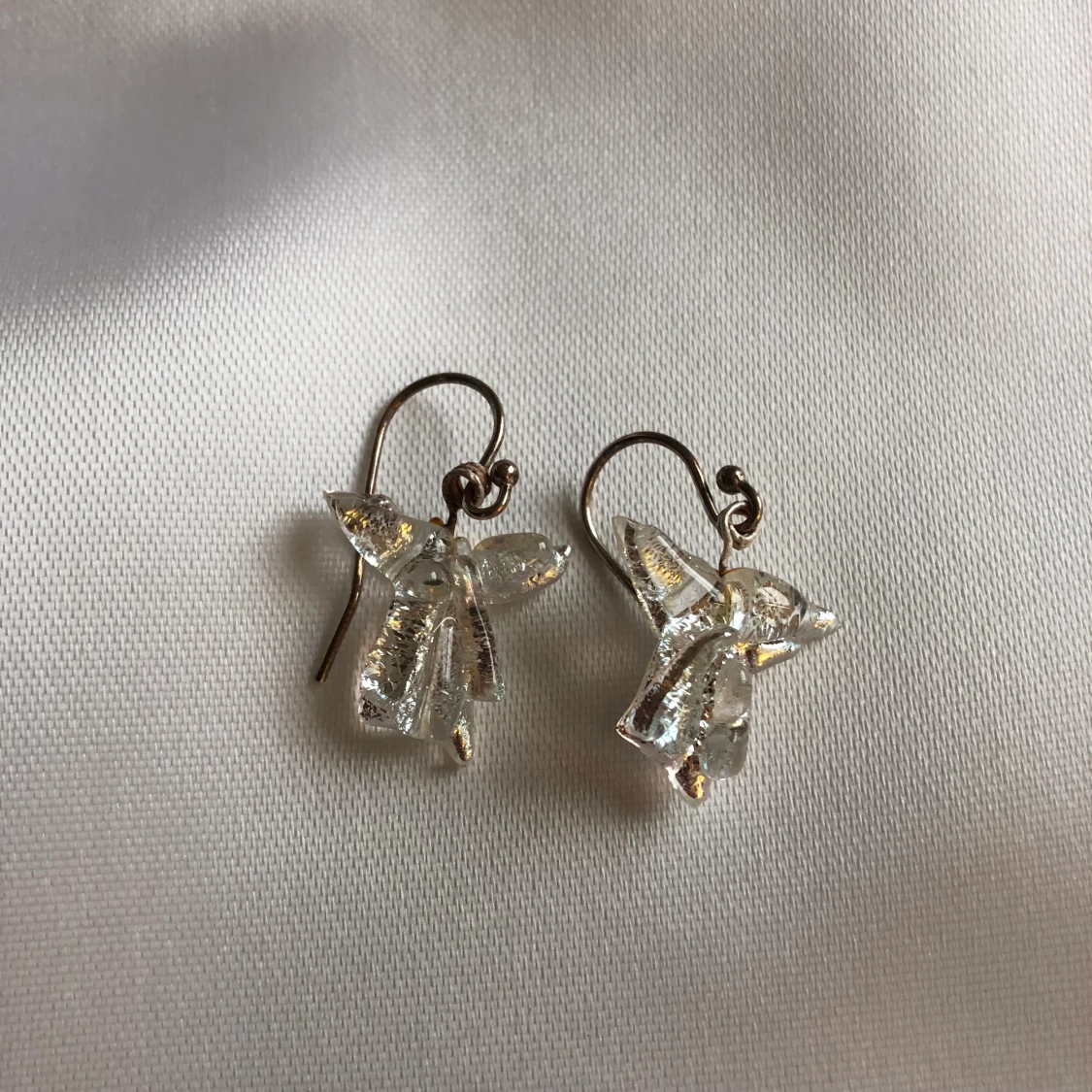 Handgjorda örhängen i glas och silver i form av änglar. Ca 2 cm. Aldrig använda.