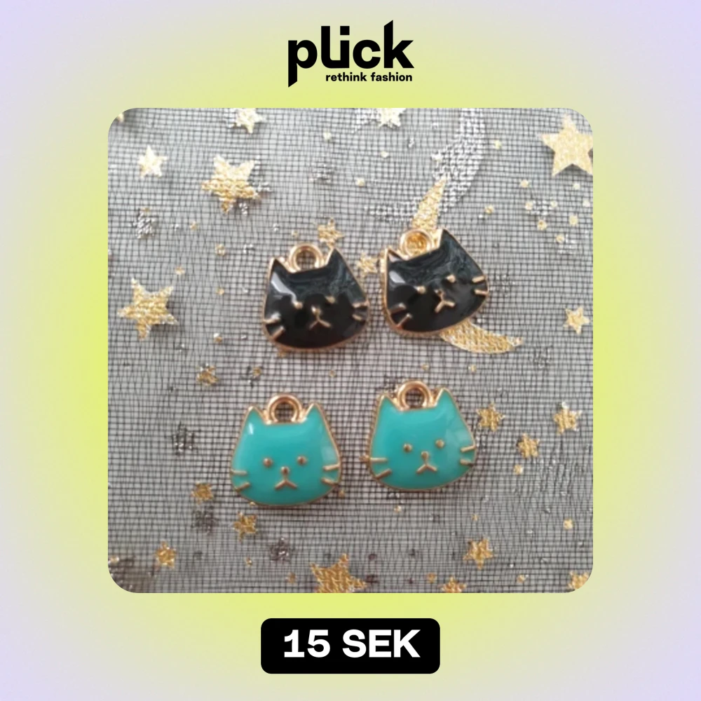 Berlocker, hängsmycke Motiv: katter Färg: blå och svart med guldfärgade baksida Antal: 4st Skick: nya/oanvända Går tex att sätta dem på halsband, armband eller göra örhängen av dem.