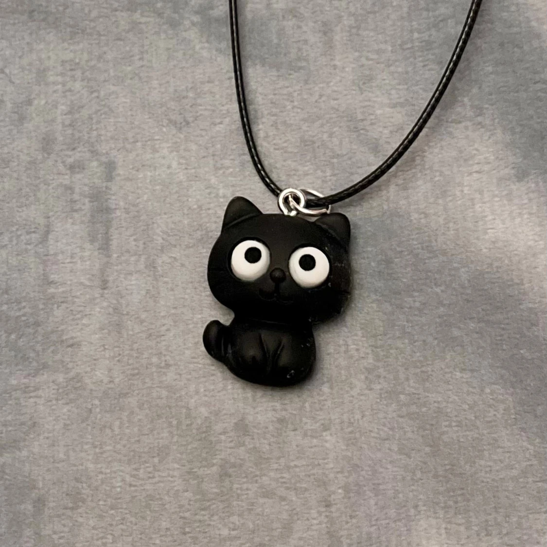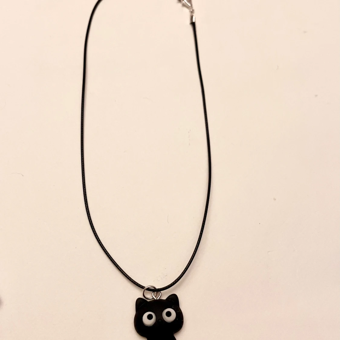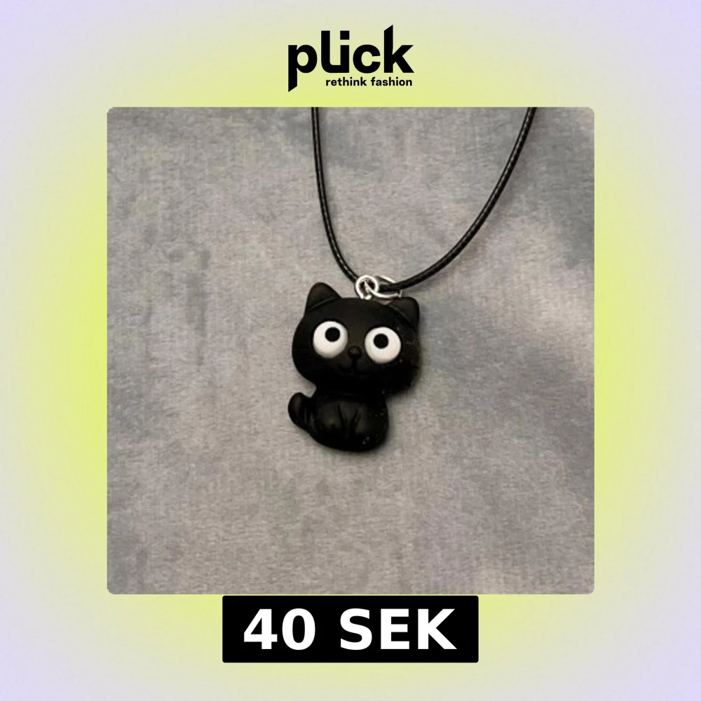 Supersöt svart katt trädd på kortare svart tråd. Halsbandet är justerbart 35-40 cm.