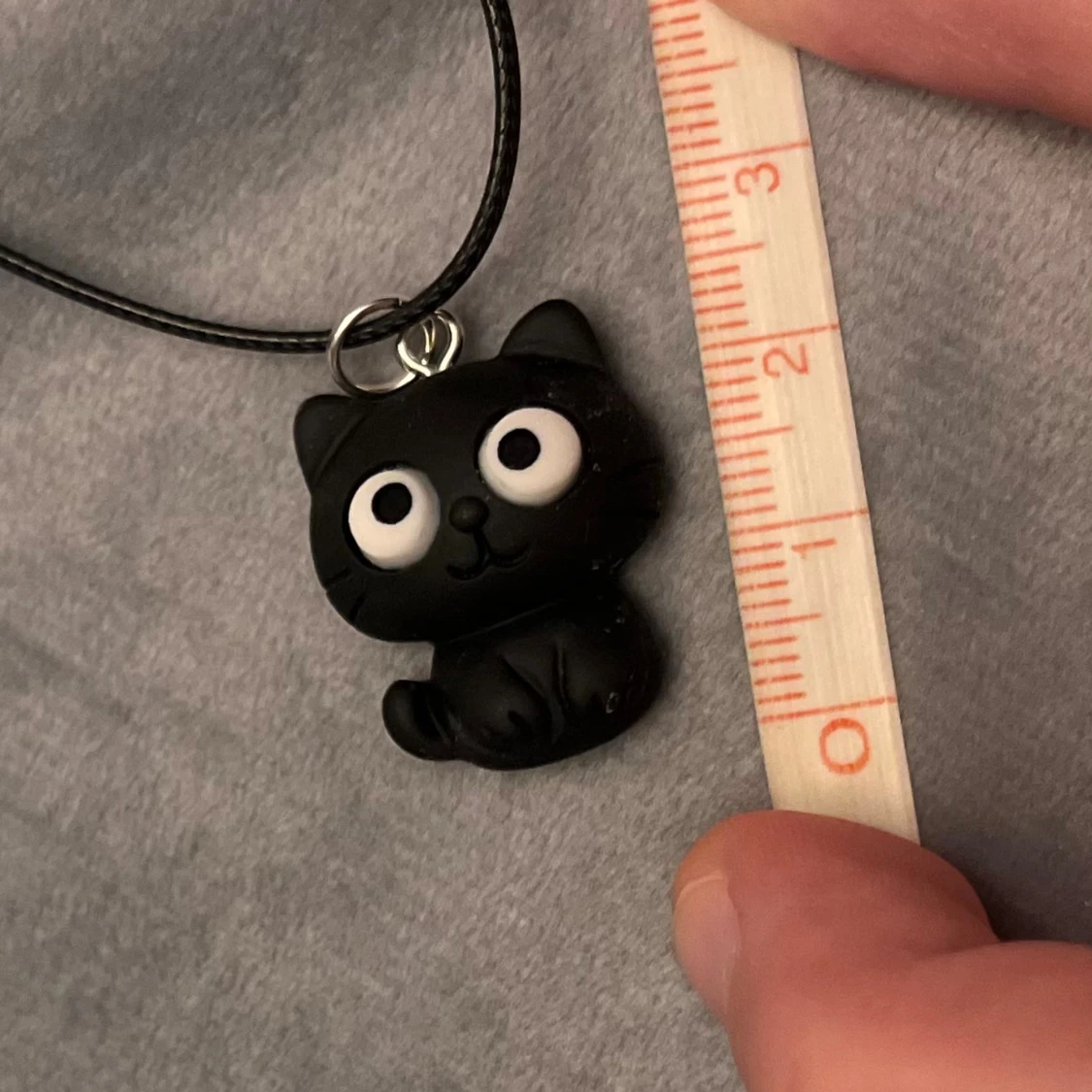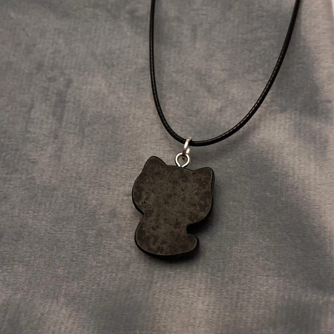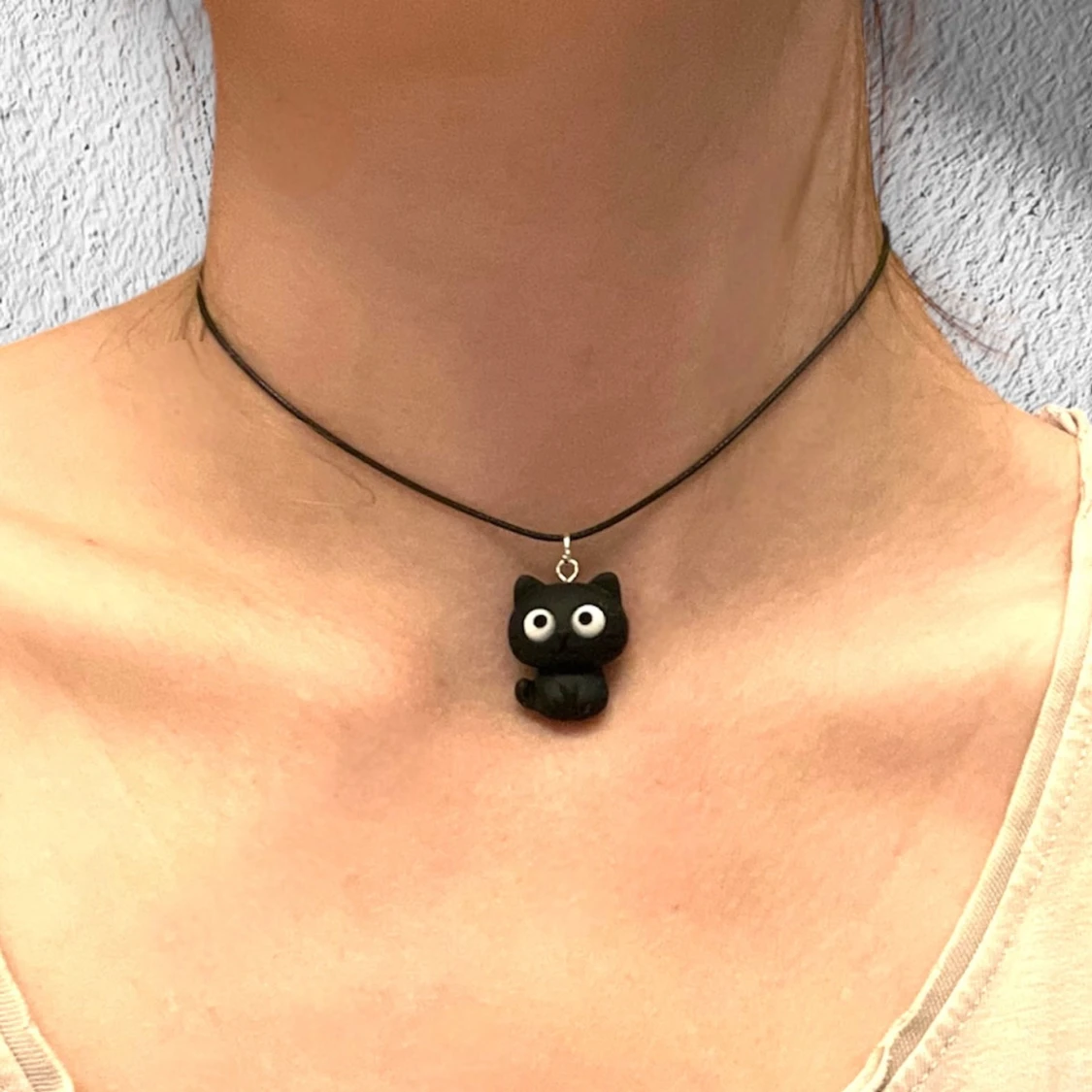 Supersöt svart katt trädd på kortare svart tråd. Halsbandet är justerbart 35-40 cm.