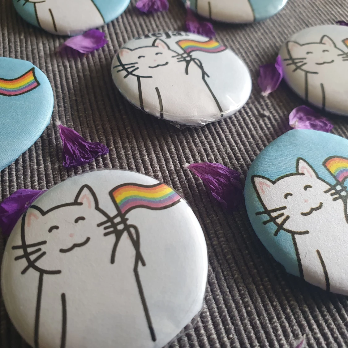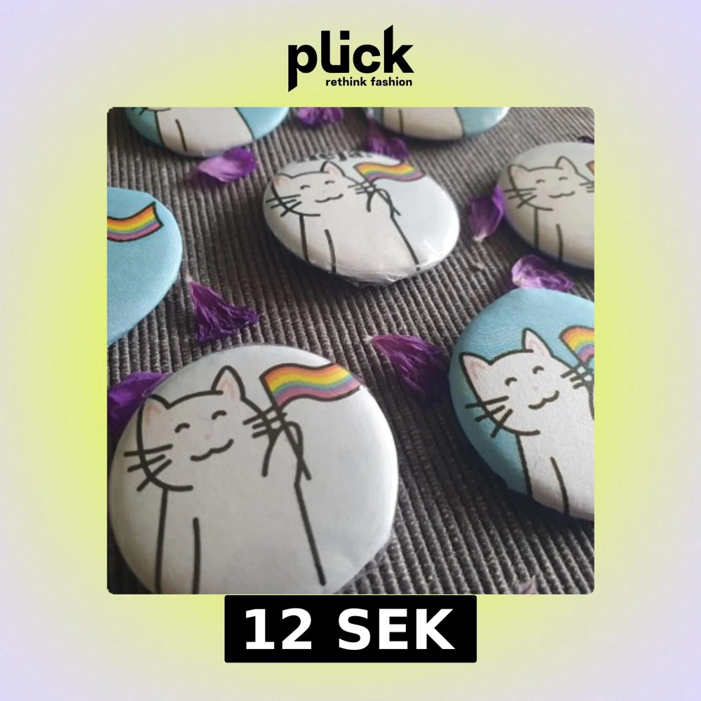 🐱Pins/knappar med en vit katt och en prideflagga på 🏳️🌈 Finns med blå bakgrund och vit bakgrund. Detta är andra sorteringen, alltså är dessa i okej skick. Vissa har lite knöglig eller lite lös plast, och andra saknar plast men är annars bra. Det finns första sorteringens också, och de är mycket bra kvalitet, men också dyrare. 🗣️ Det finns många utan text men även några få som det står “Heja!“ på. ✨Jag har både designat och tillverkat dem själv!
